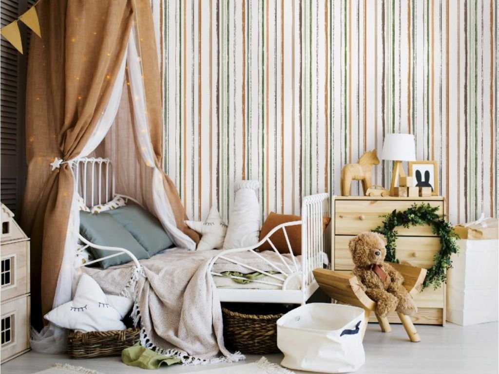 Barevná nástěnná tapeta PRUHY do dětského pokoje HNĚDÁ