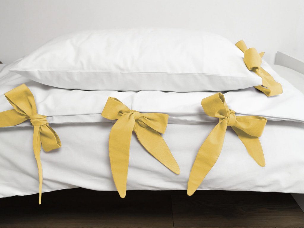| Sada obsahuje: | 1 povlak na přikrývku s ozdobnými mašlemi na samozavazování v rozsahu každých 20-30 cm, 1 povlak na polštář s ozdobnými mašličkami na samozavazování |