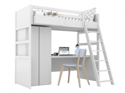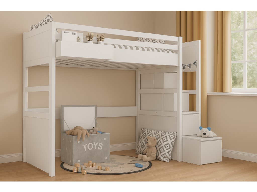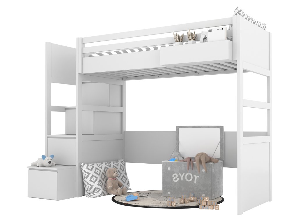 Bílá vyvýšená postel SIMONE s úložnými schody a policí 90x200 cm