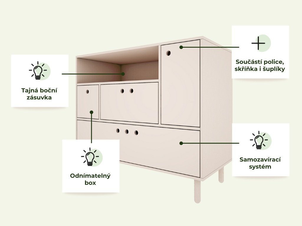 Součástí 2 šuplíky, skříňka, police i odnímatelný box
