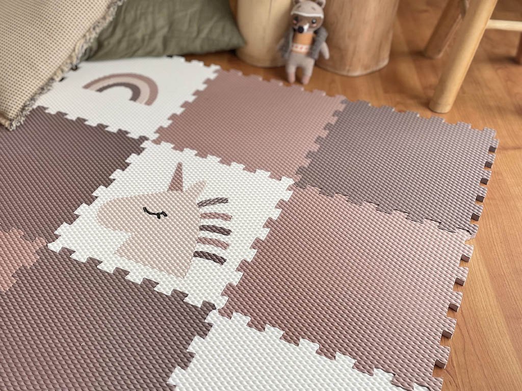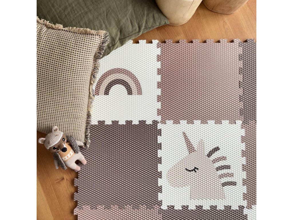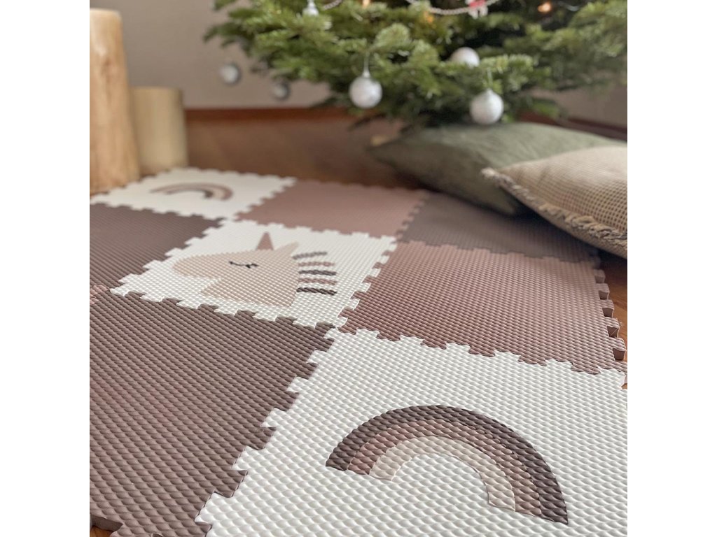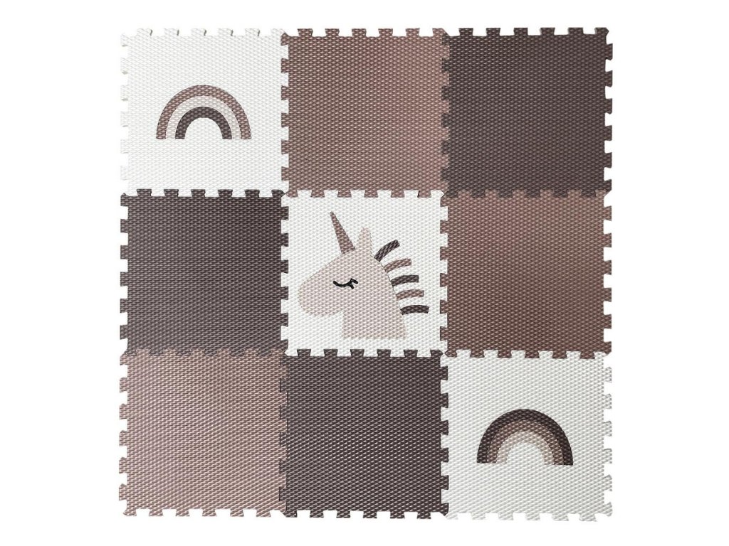 | Sada obsahuje: | 9 podlahových dílů (3 ks tmavě hnědý, 3 ks hnědý, 1 ks bílý s krémovým jednorožcem, 2 ks bílý s hnědou duhou) |