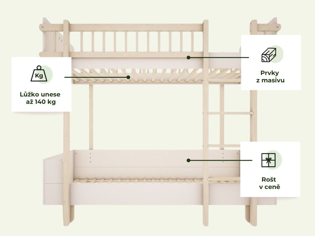| Horní lůžko vhodné: | pro děti od 6 let dle normy EN 747-1, Pro děti s drobnější postavou doporučujeme měkký mantinel mezi matraci a rám pro větší pohodlí a bezpečí. |