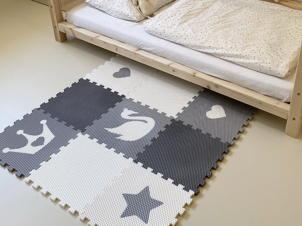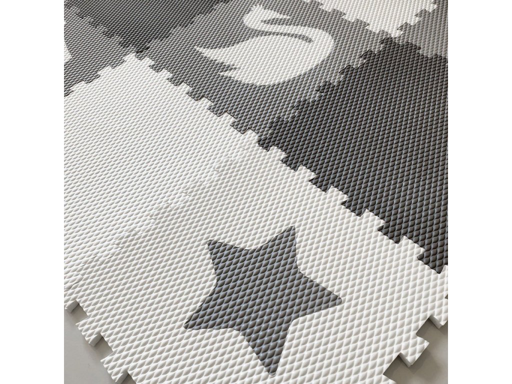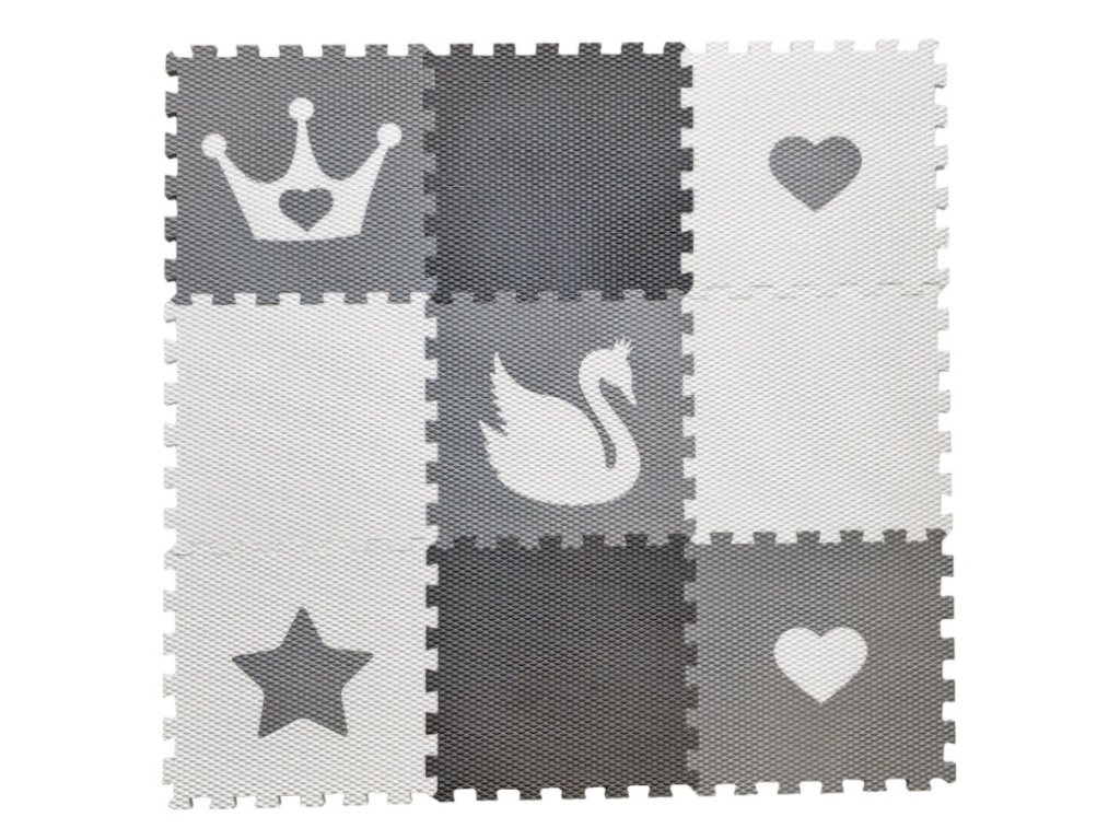 | Sada obsahuje: | 9 podlahových dílů (2 ks šedý, 2 ks bílý, 1 ks světle šedý s bílou labutí, 1 ks světle šedý s bílou korunkou, 1 ks světle šedý s bílým srdcem, 1 ks bílý se světle šedou hvězdou, 1 ks bílý se světle šedým srdcem) |