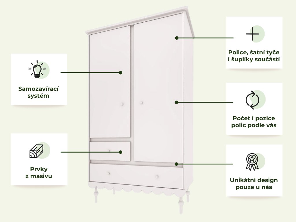 | Vlastnosti produktů: | Se šuplíky, S šatní tyčí, S policemi, S podnoží |