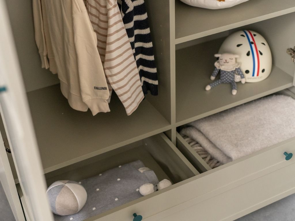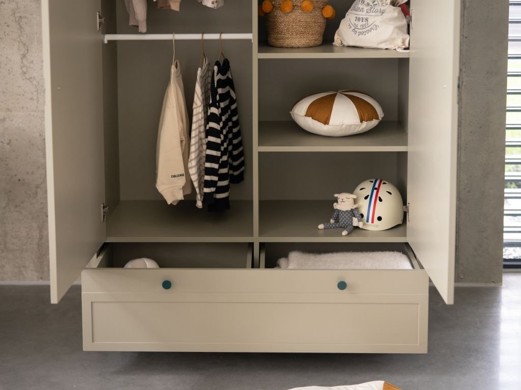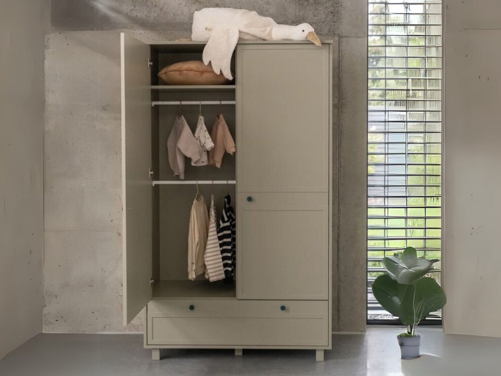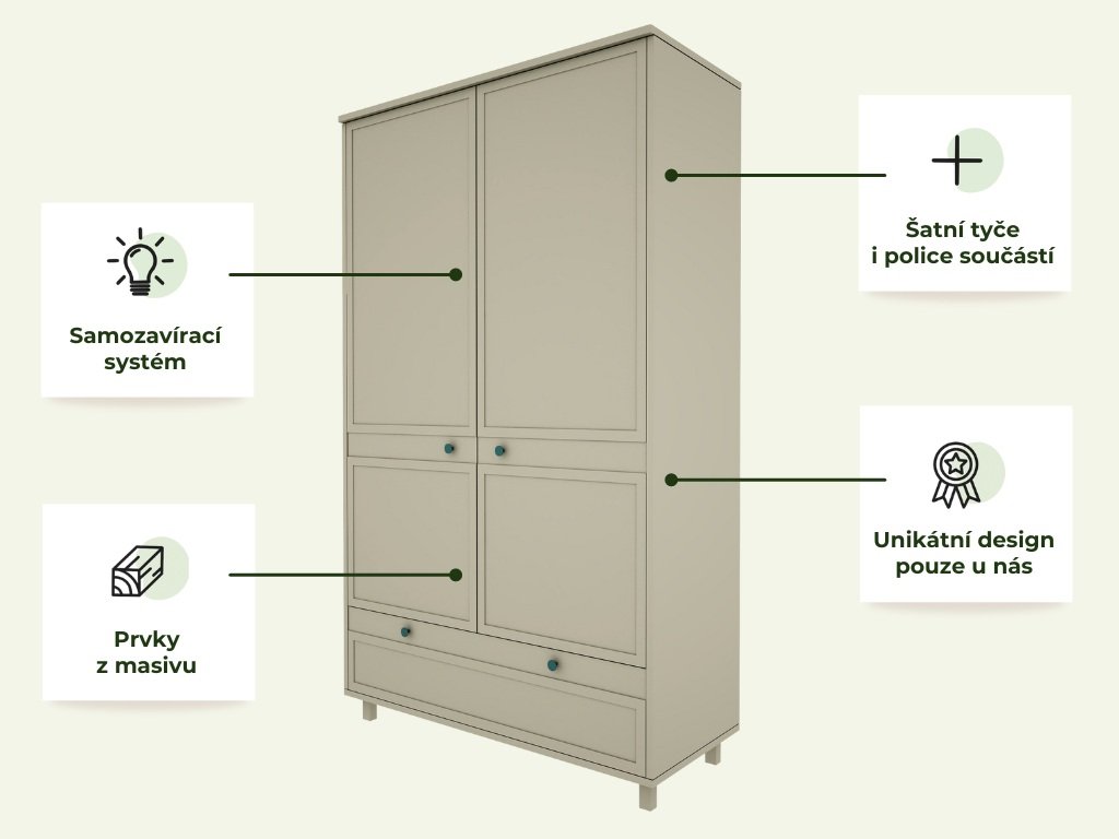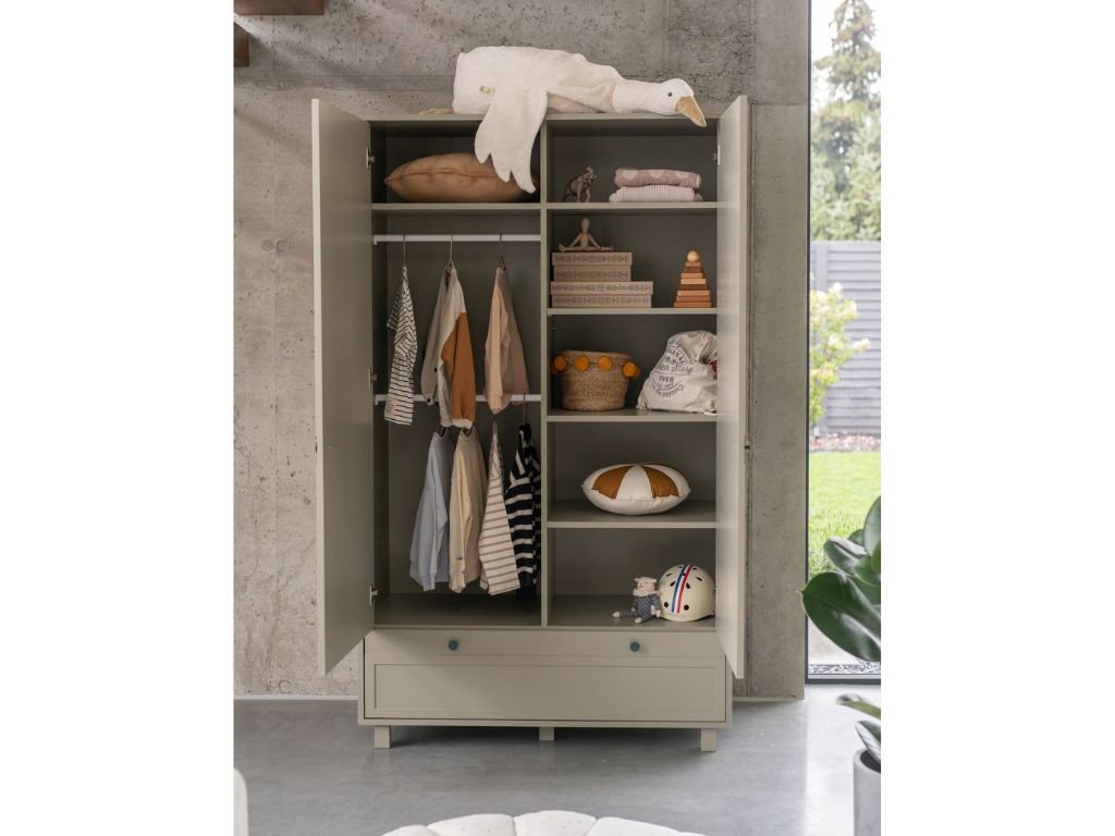 Dětská šatní skříň VINTAGE se šuplíkem, tyčemi a policemi eukalyptová