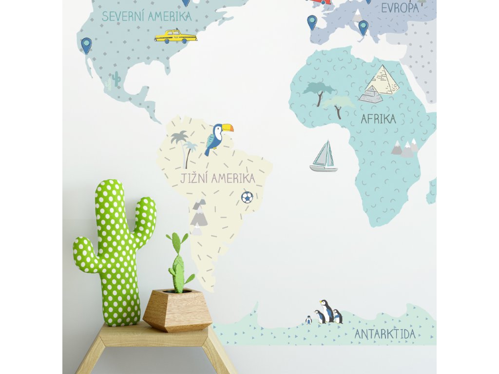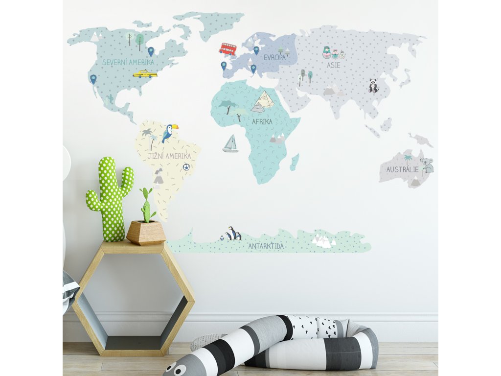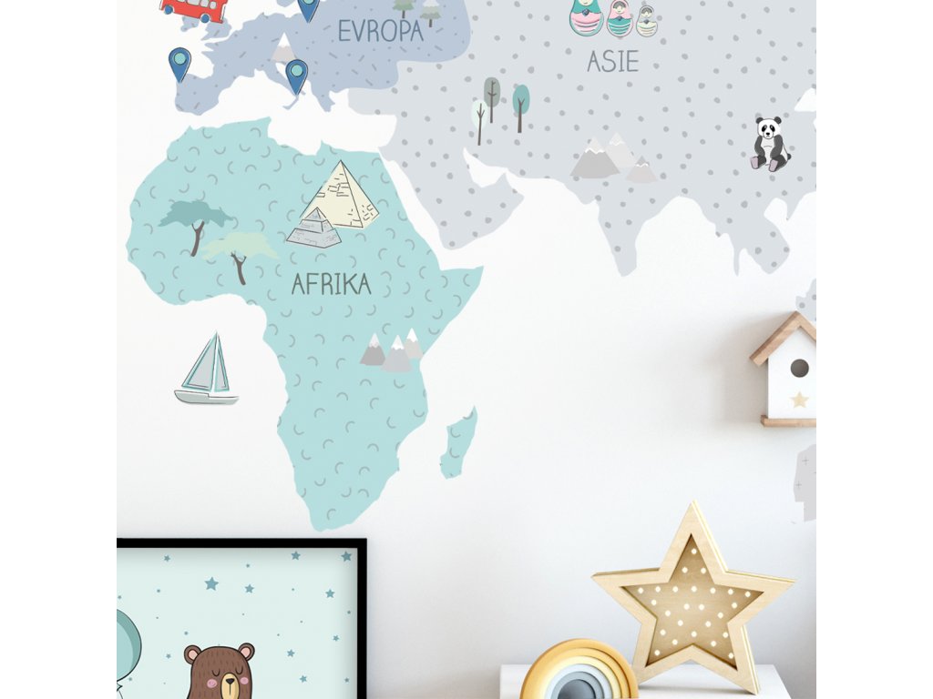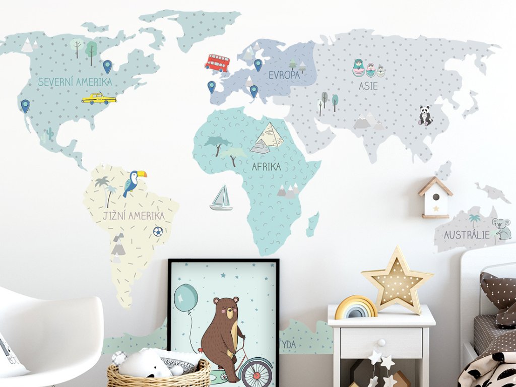 Dětské nástěnné samolepky MAPA SVĚTA mátové