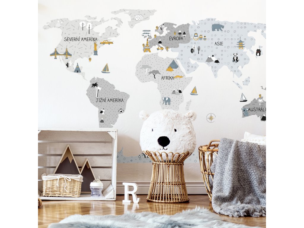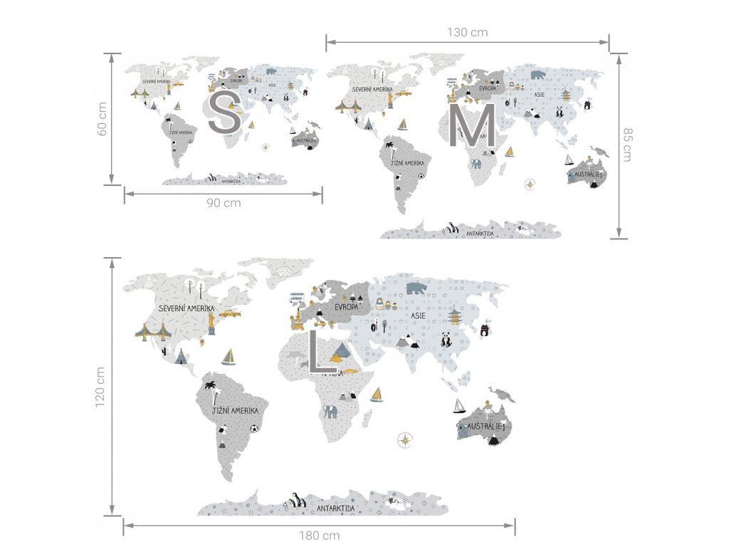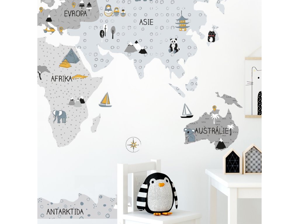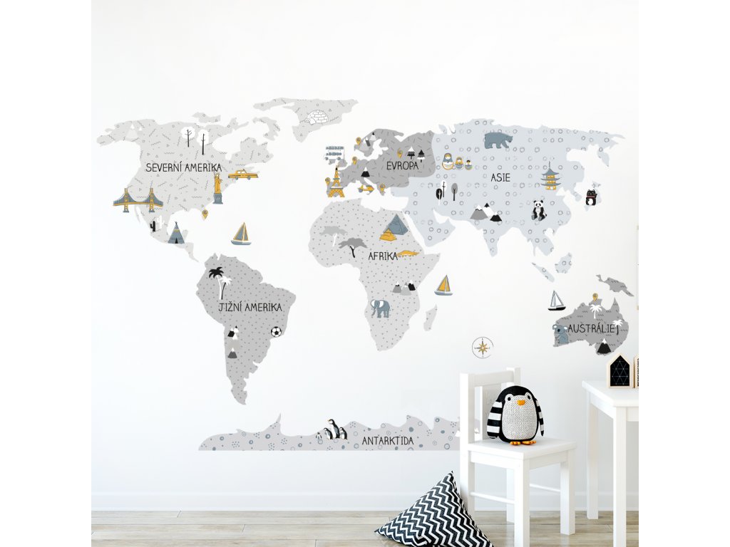 Dětské nástěnné samolepky MAPA SVĚTA šedé