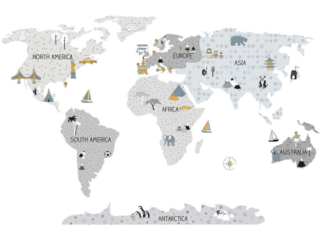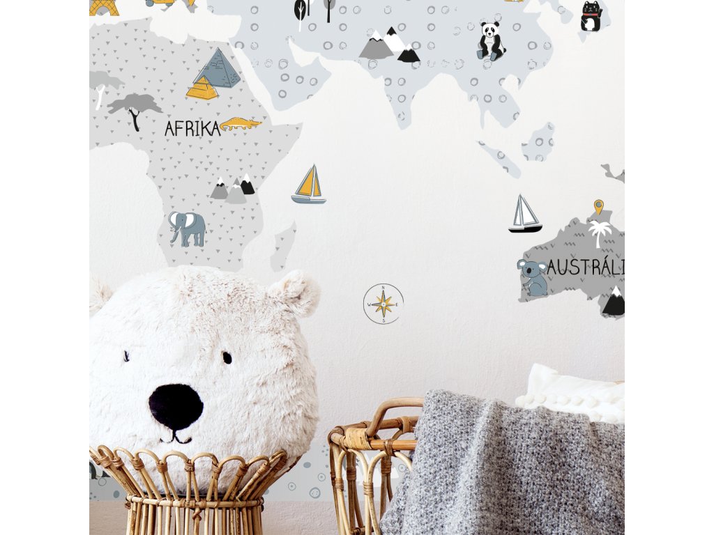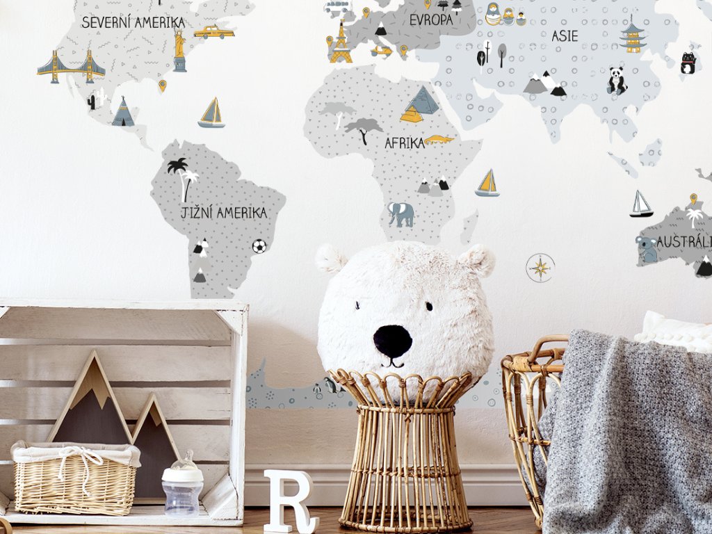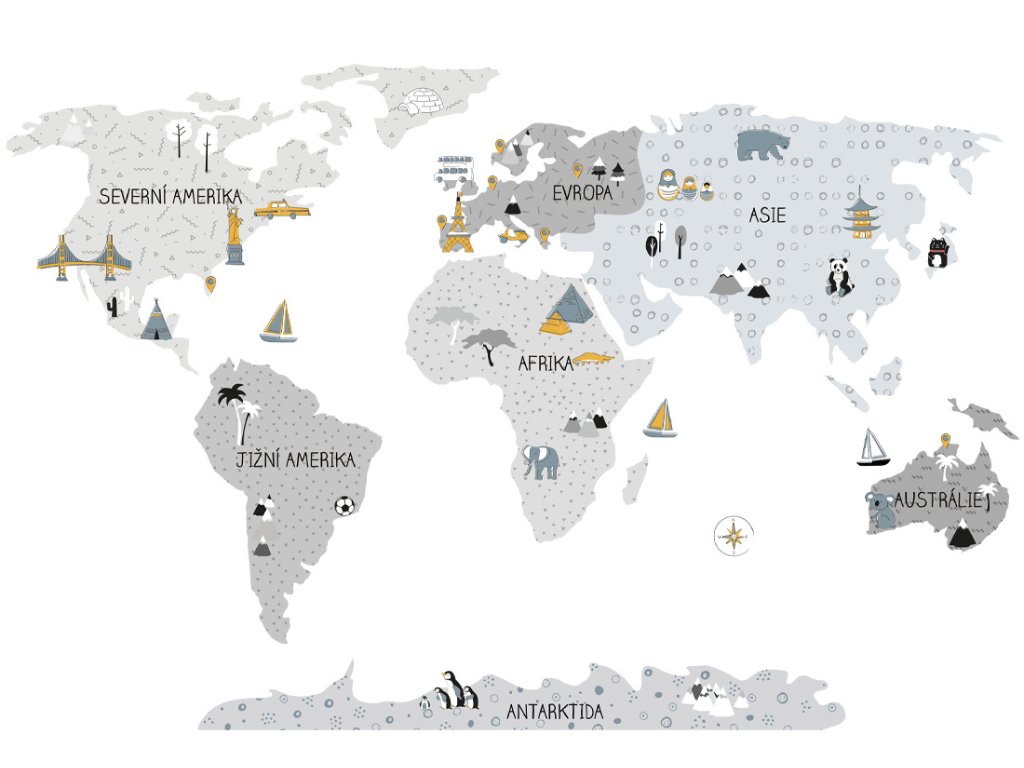 Dětské nástěnné samolepky MAPA SVĚTA šedé