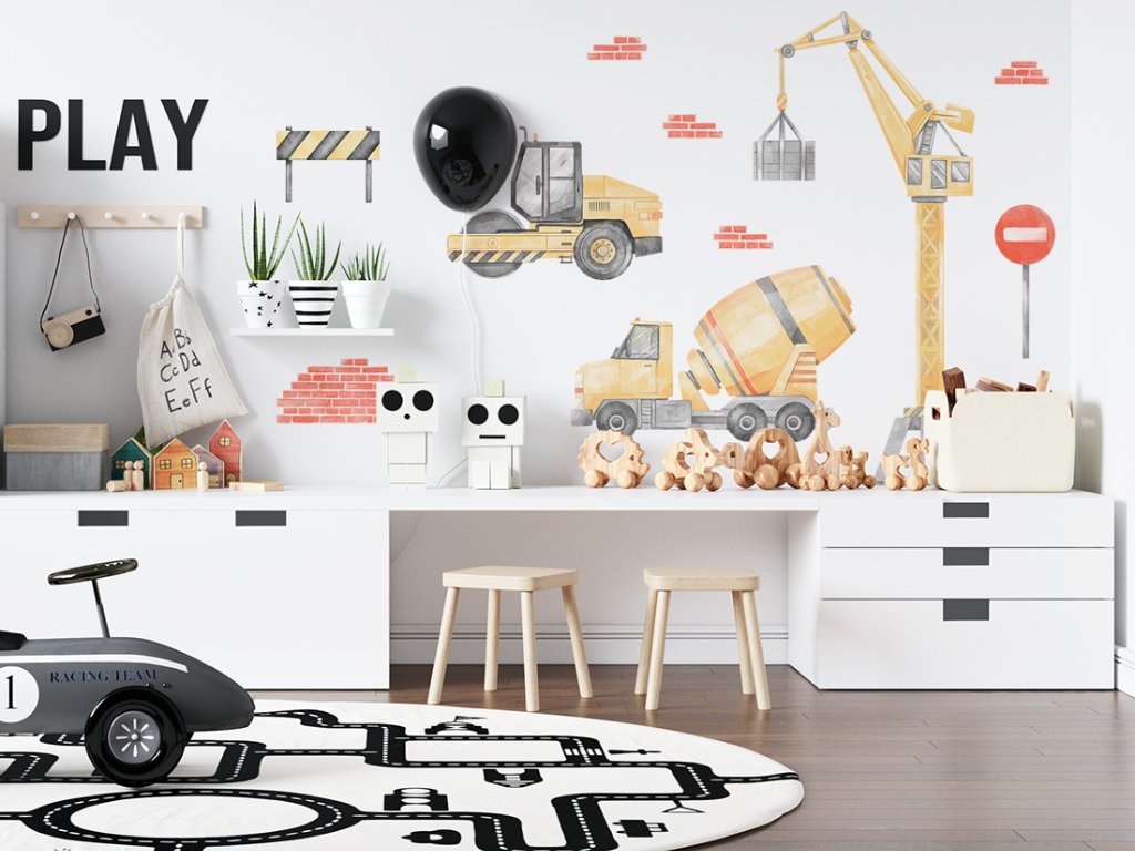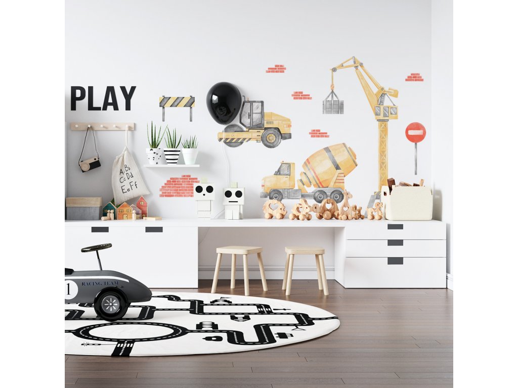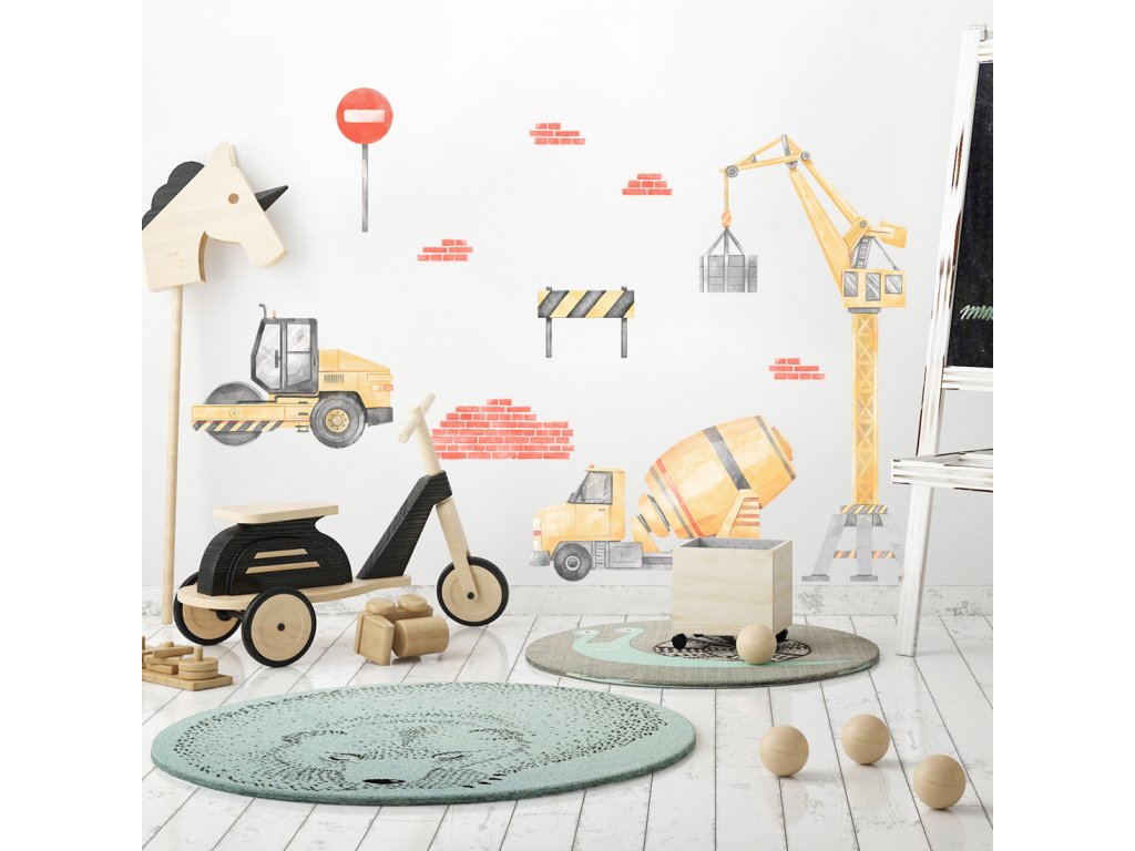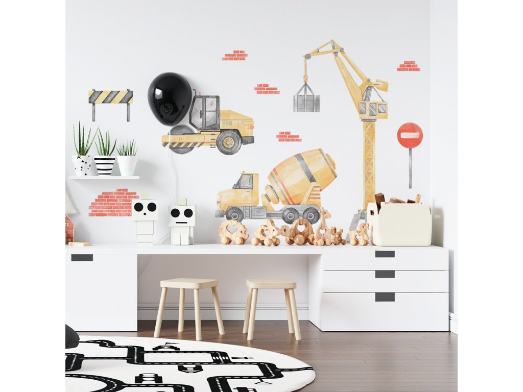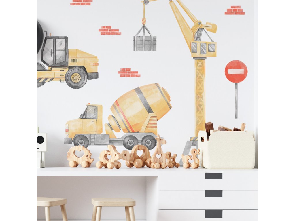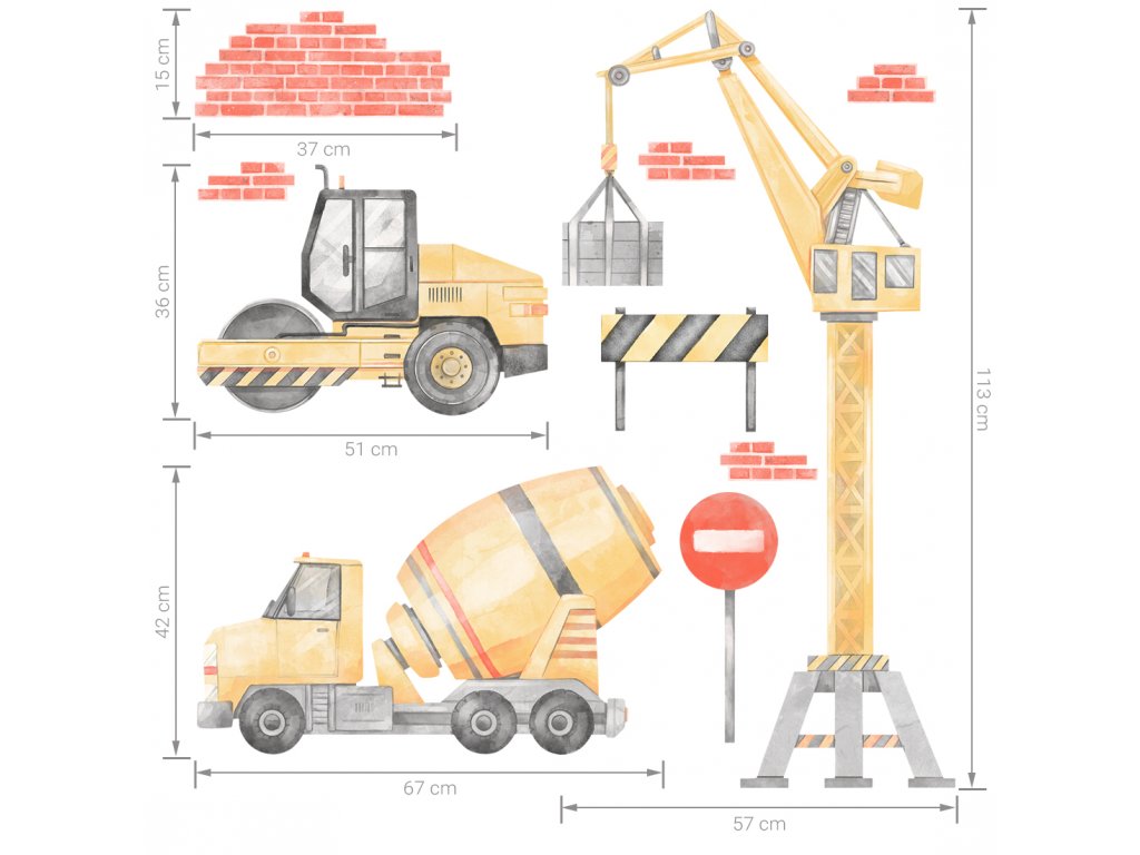 Dětské samolepky na zeď STAVEBNÍ STROJE žluté