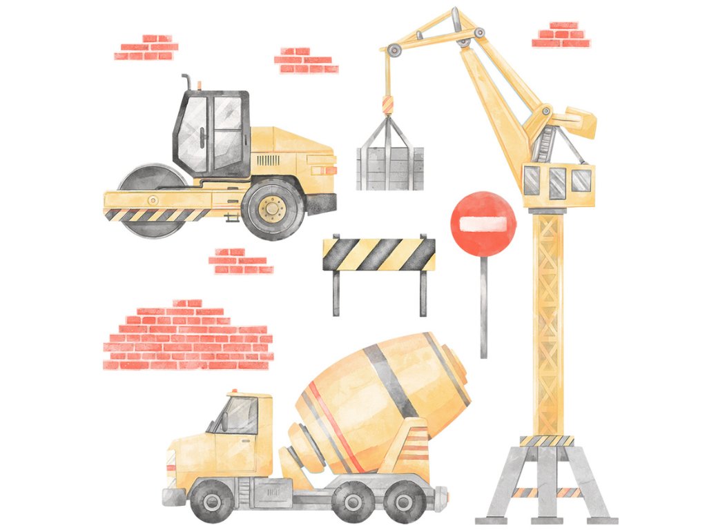 | Sada obsahuje: | míchačku na beton, jeřáb, silniční válec, dopravní značky, cihlové zdi |