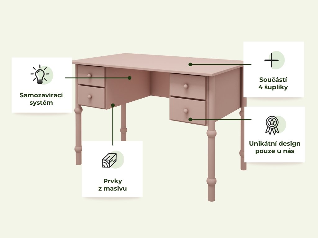 Psací stůl doporučujeme doplnit o ergonomickou židli pro pohodlné a bezpečné sezení vašeho dítka.