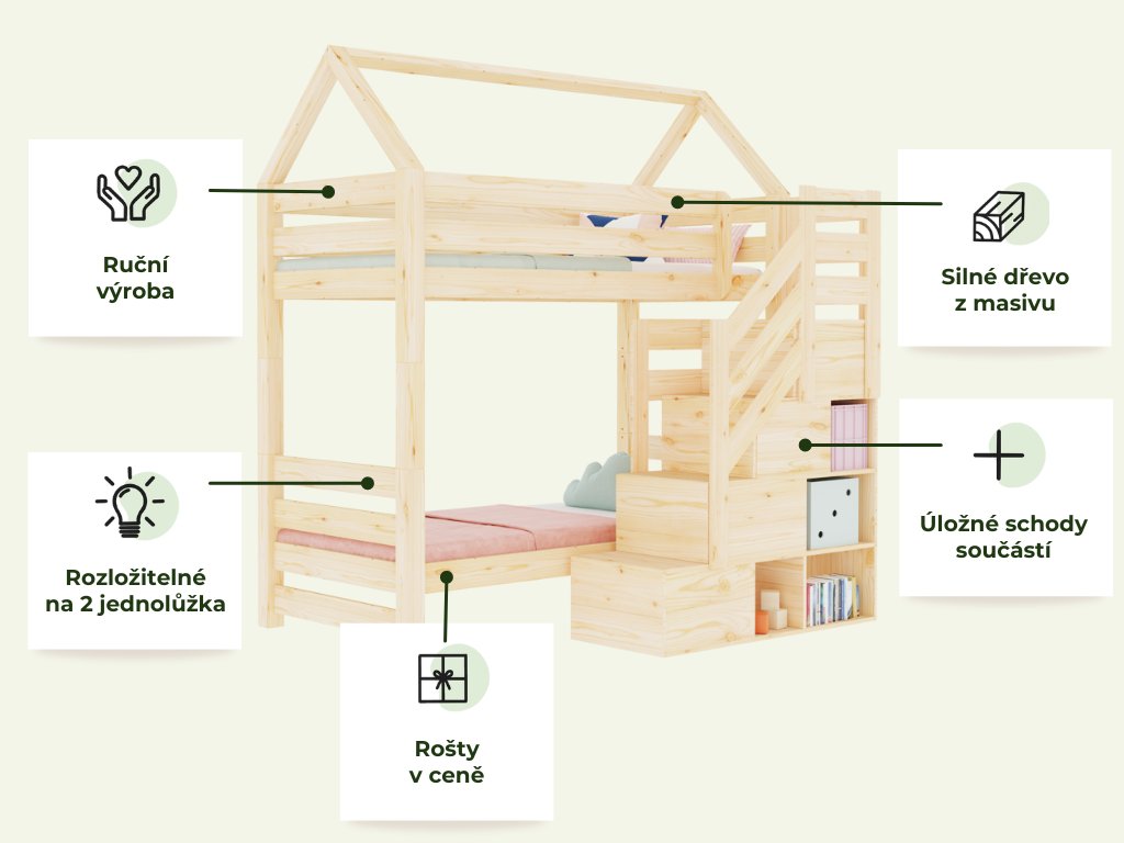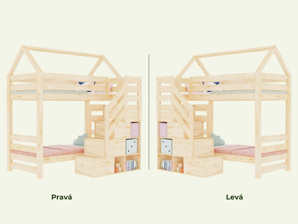 | Speciální vlastnosti: | ruční výroba, spousta úložného prostoru, lze rozložit na dvě samostatné postele, schody lze namontovat na levou i pravou stranu, šuplíky jsou plně výsuvné |