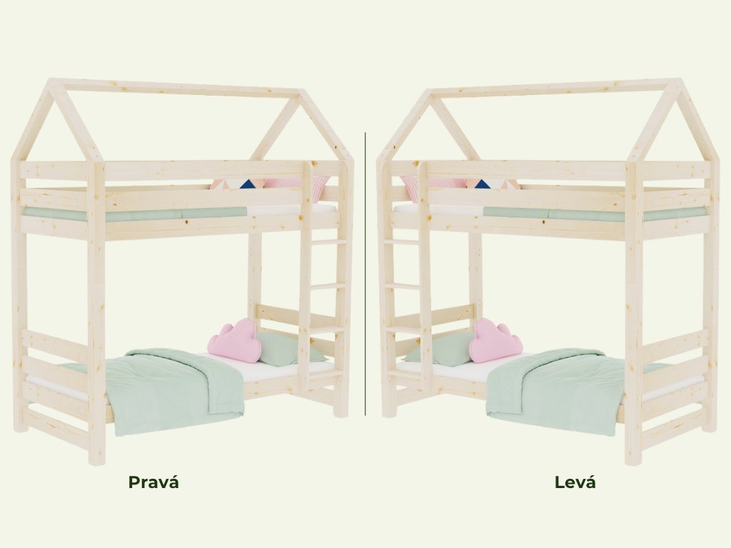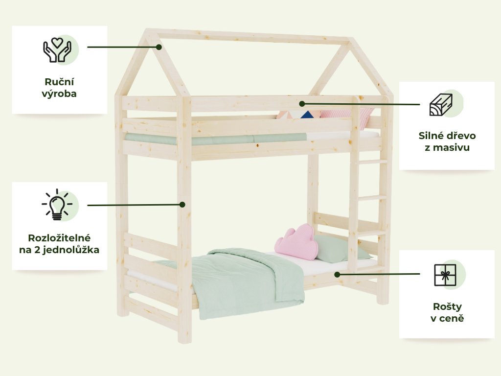 | Speciální vlastnosti: | ruční výroba, žebřík lze namontovat na levou i pravou stranu, lze rozložit na dvě samostatné postele |