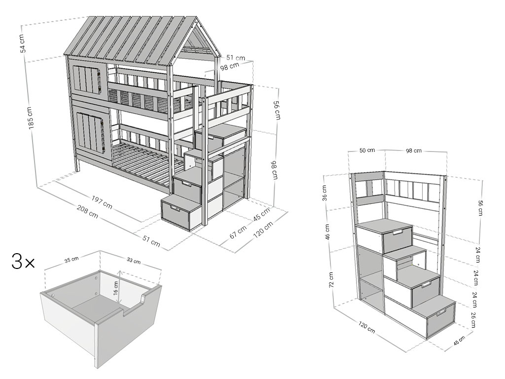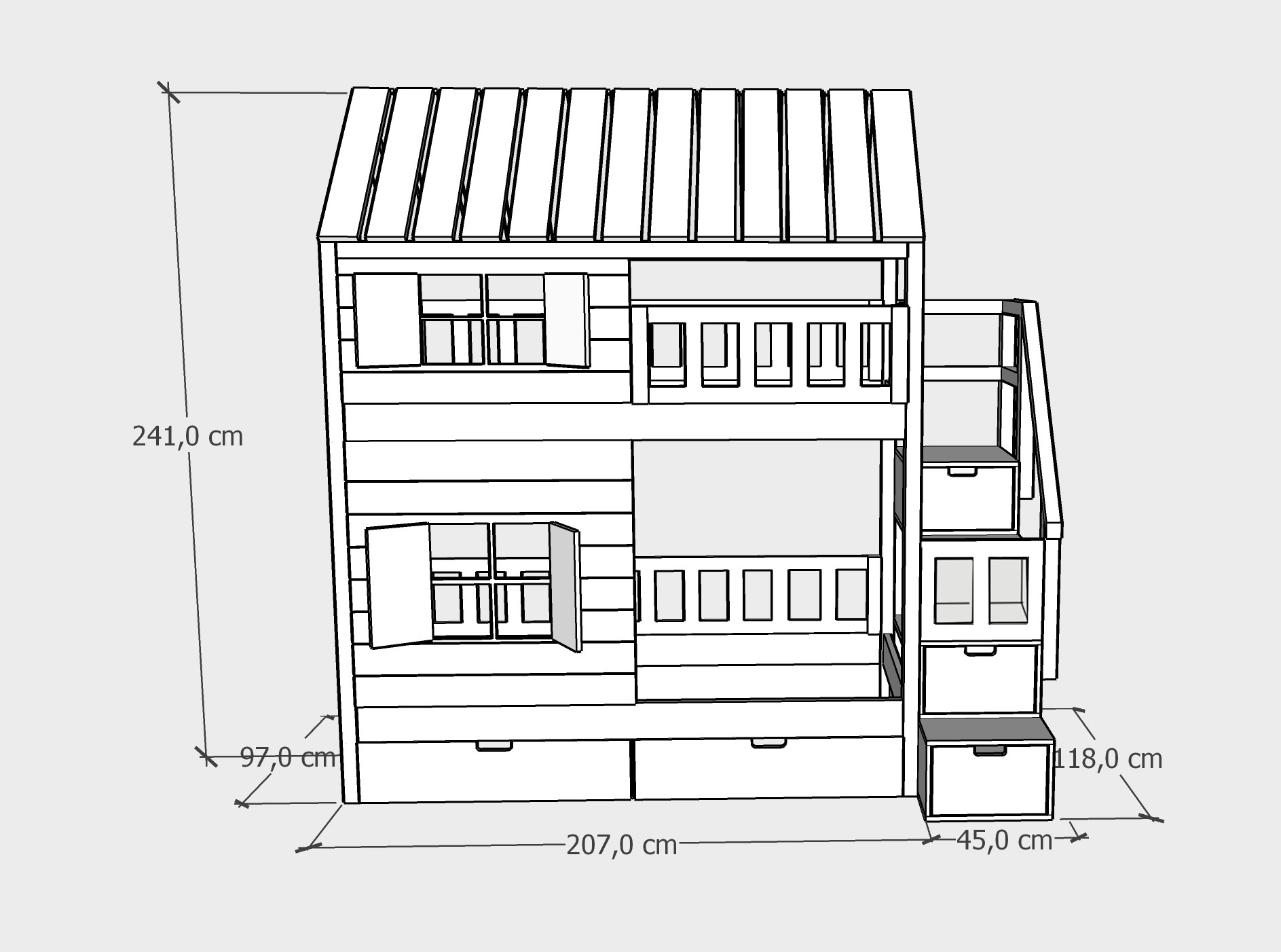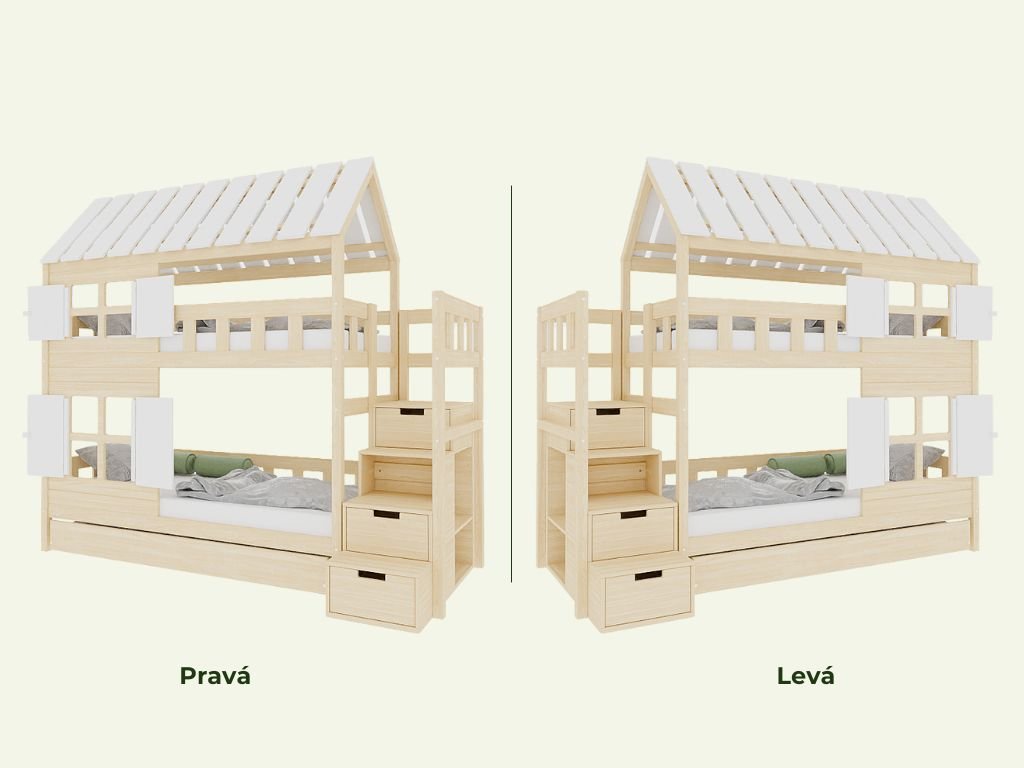 Domečková patrová postel CHALOUPKA s úložnými schody 90x200 cm