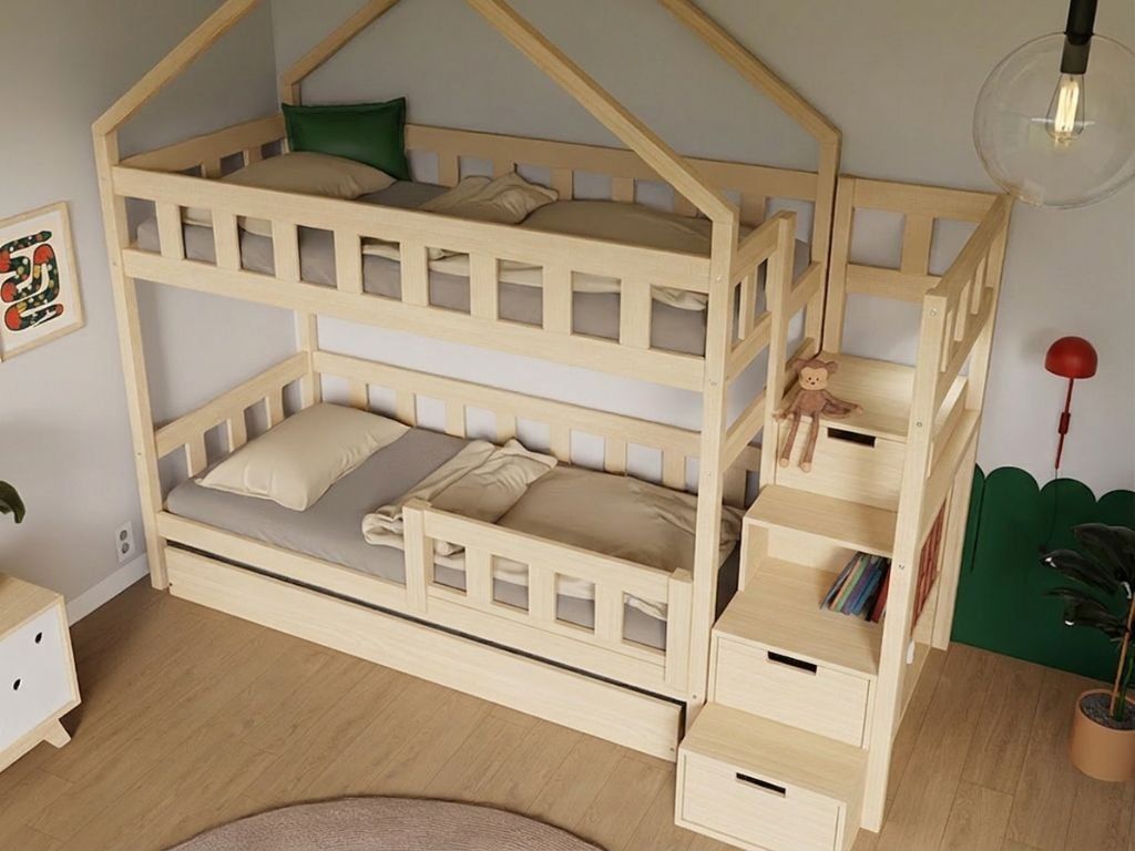 Domečková patrová postel PLOTTY s úložnými schody 90x200 cm