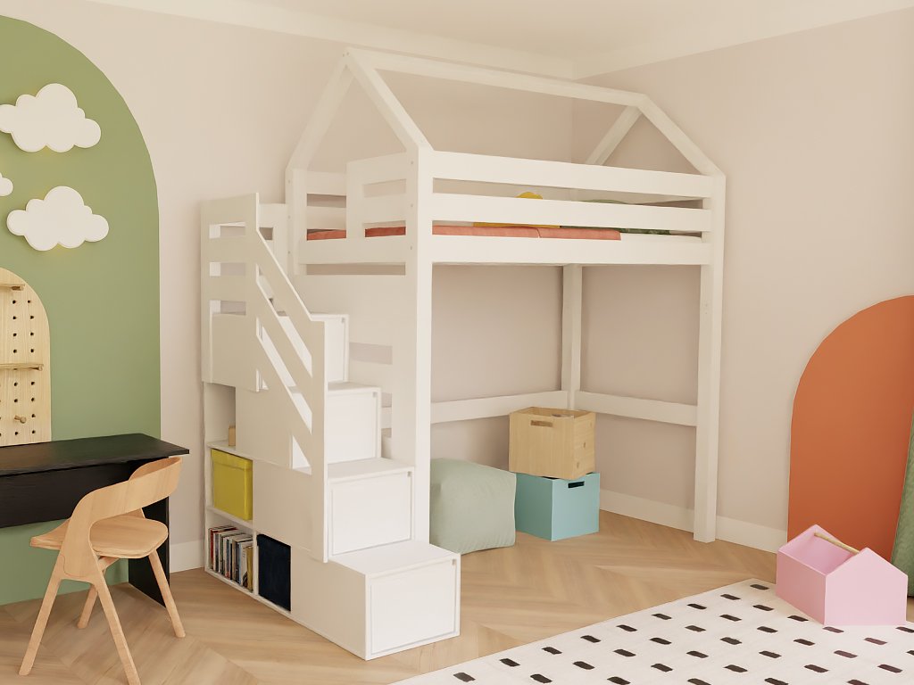 Domečková zvýšená postel MANASLU s úložnými schody 90x200 cm