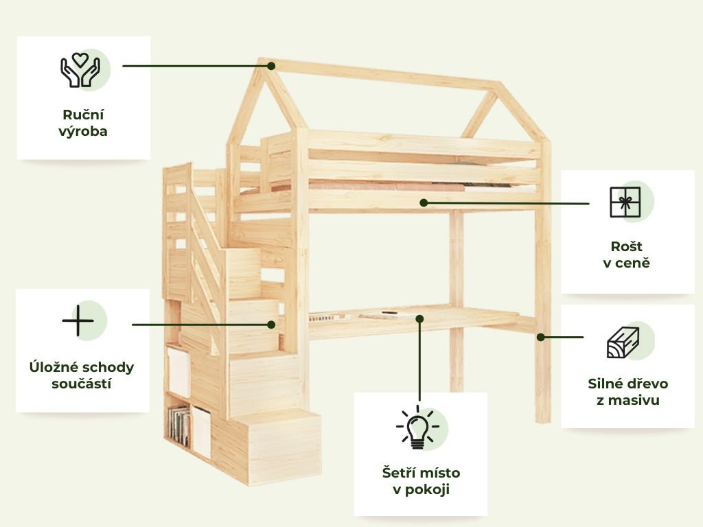 | Speciální vlastnosti: | ruční výroba, spousta úložného prostoru, schody lze namontovat na levou i pravou stranu, šuplíky jsou plně výsuvné |