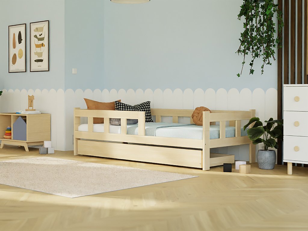 Dřevěná jednolůžková postel FENCE 4v1 se zábranou a úložným šuplíkem