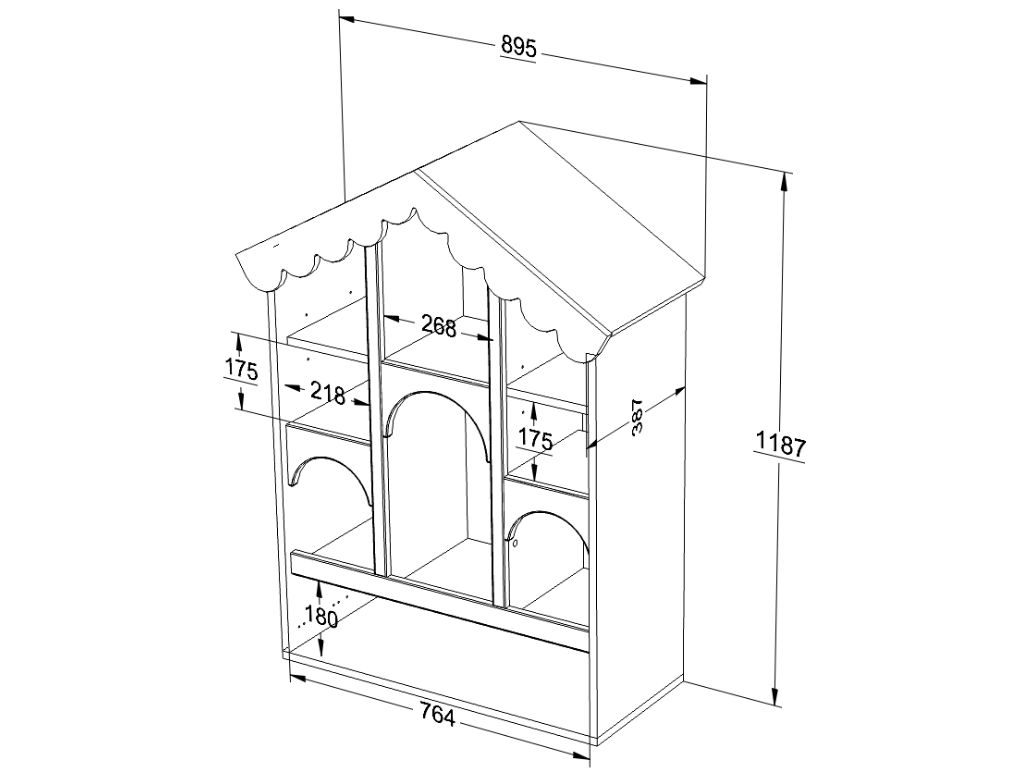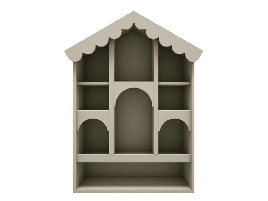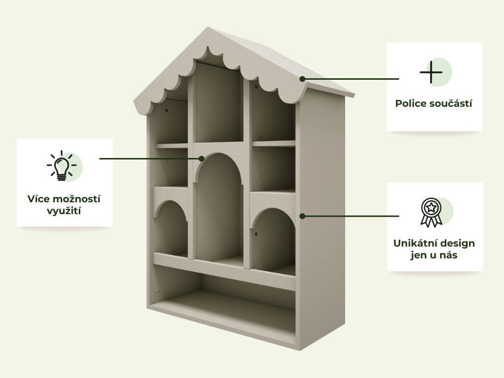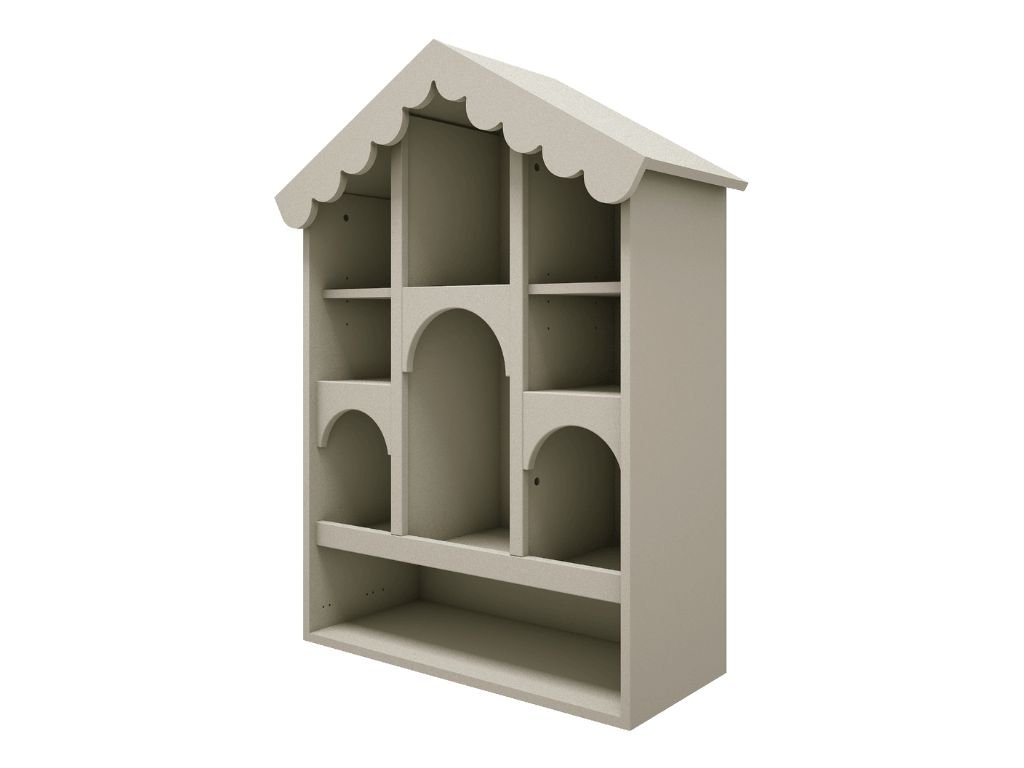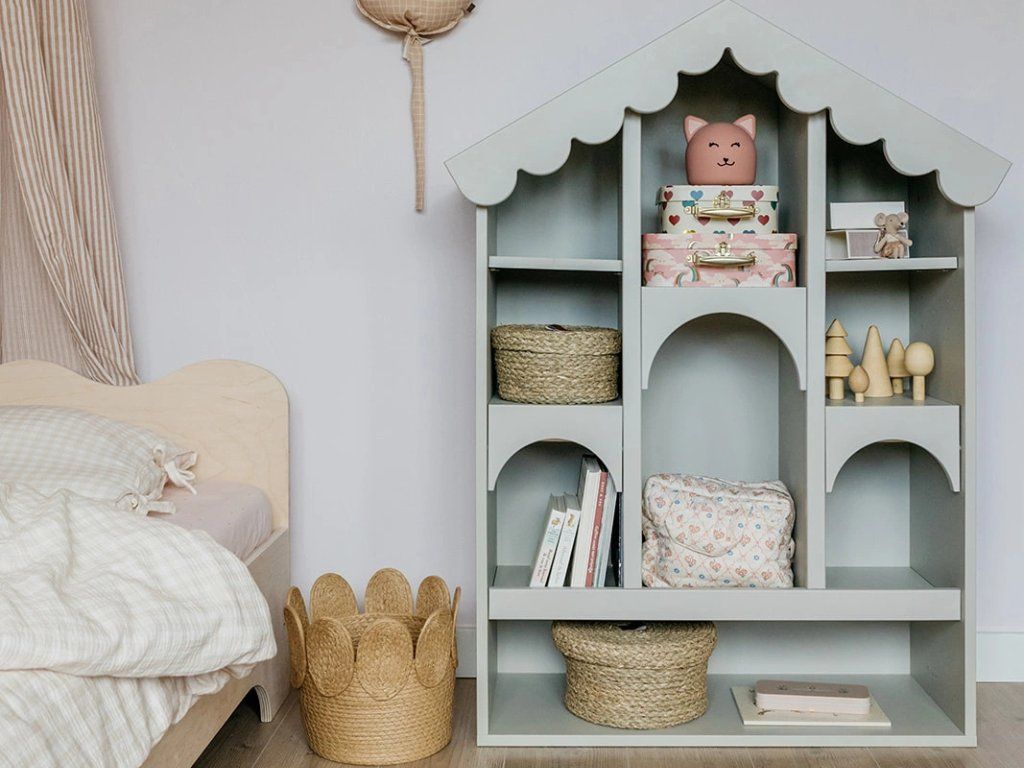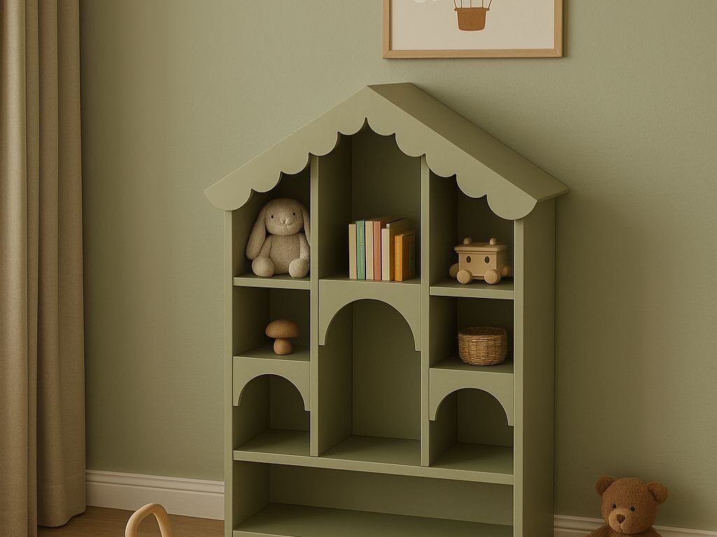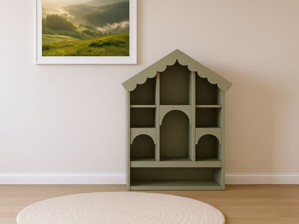 Dřevěná knihovna BABUSHKA do dětského pokoje ve tvaru domku olivová