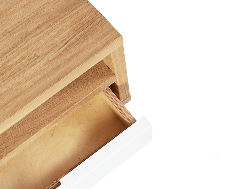 | Materiál 1. varianty: | korpus nábytku a nohy jsou vyrobené z masivního dubového dřeva, polomatné čelo zásuvky z lakované MDF desky |