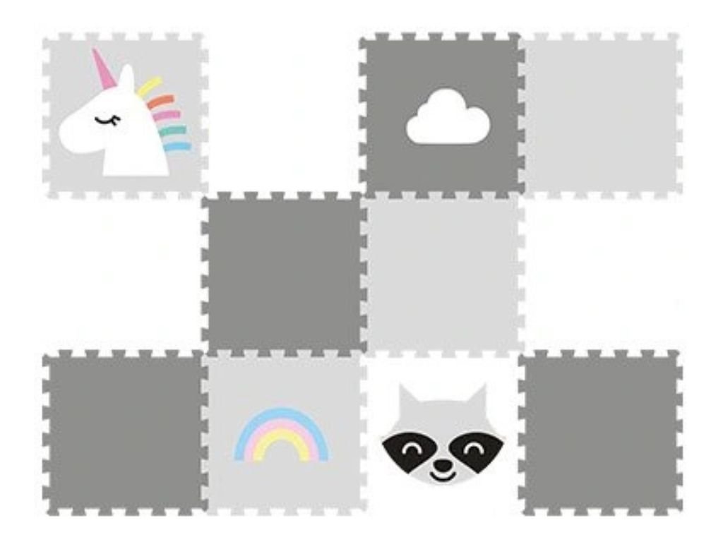 | Sada obsahuje: | 12 podlahových dílů (3 ks bílé, 3 ks šedé, 2 ks světle šedé, 1 ks jednorožec, 1ks mráček, 1 ks mýval, 1ks duha) |