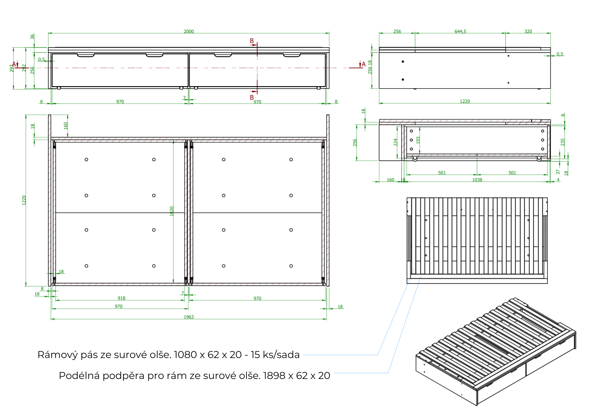 | Rozměr pod postel 120x200 cm: | 2x šířka 97 cm x výška 25,6 cm (včetně koleček) x hloubka 103,8 cm |