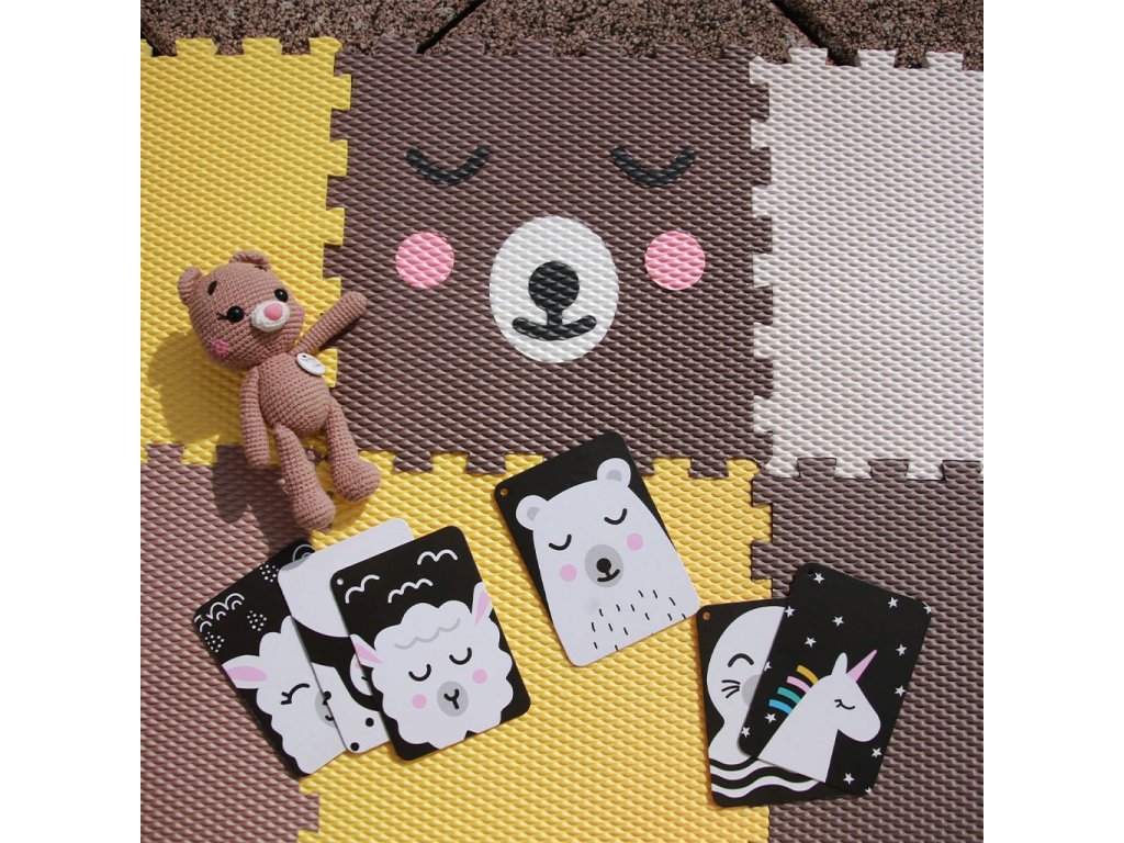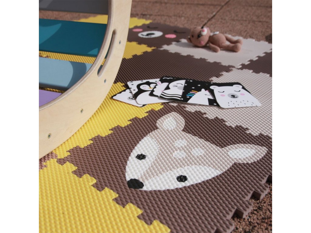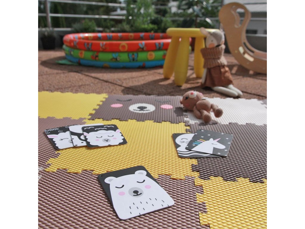 | Sada obsahuje: | 16 podlahových dílů (4 ks hnědý, 3 ks krémový, 4 ks tmavě žlutý, 1 ks tmavě hnědý, 1 ks tmavě hnědý medvěd, 1 ks tmavě hnědý s hnědou tlapkou, 1 ks tmavě hnědý s krémovým kolouškem, 1 ks krémový s tmavě hnědým kolouškem) |