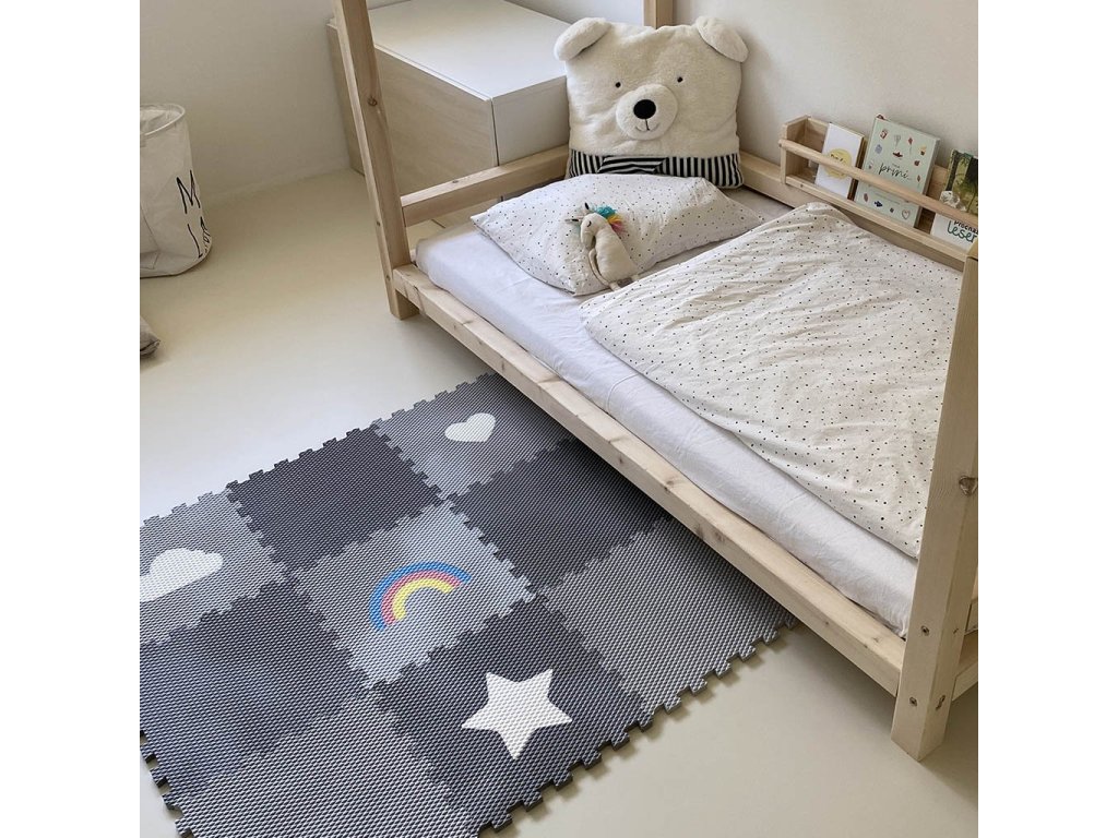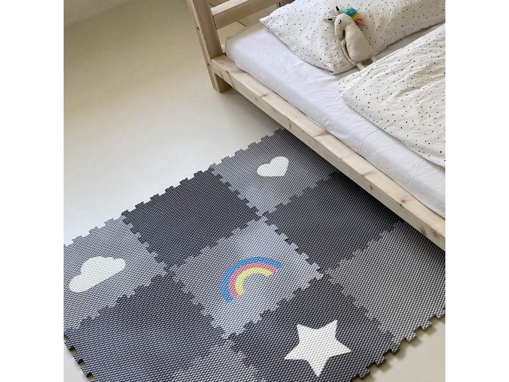 | Sada obsahuje: | 9 podlahových dílů (2 ks světle šedý, 3 ks šedý, 1 ks světle šedý s bílým kráčkem, 1 ks světle šedý s bílým srdcem, 1 ks šedý s bílou hvězdou, 1 ks světle šedá duha) |
