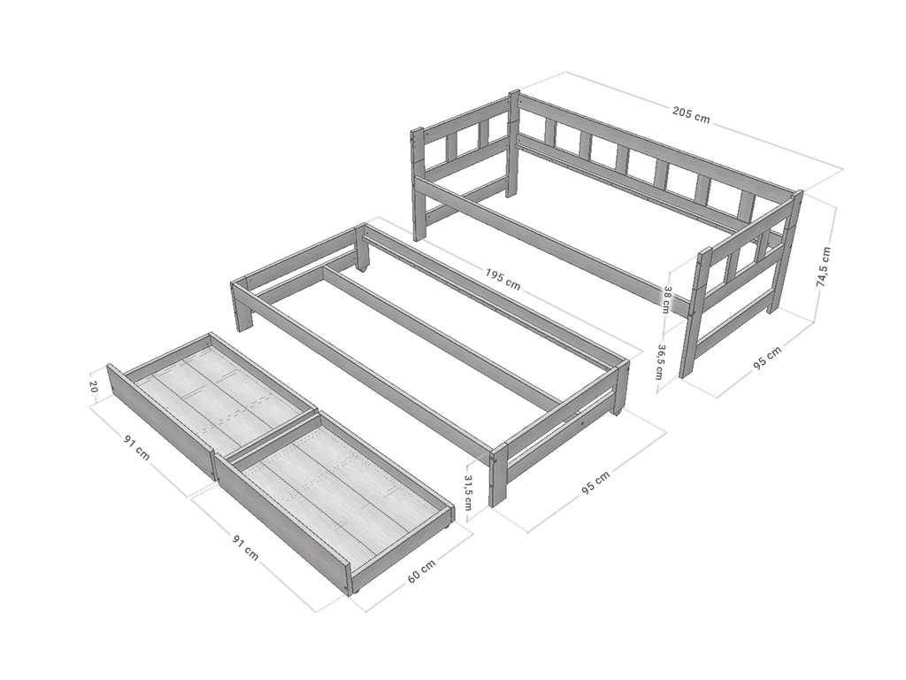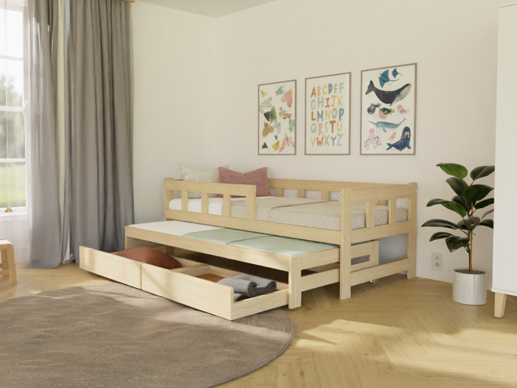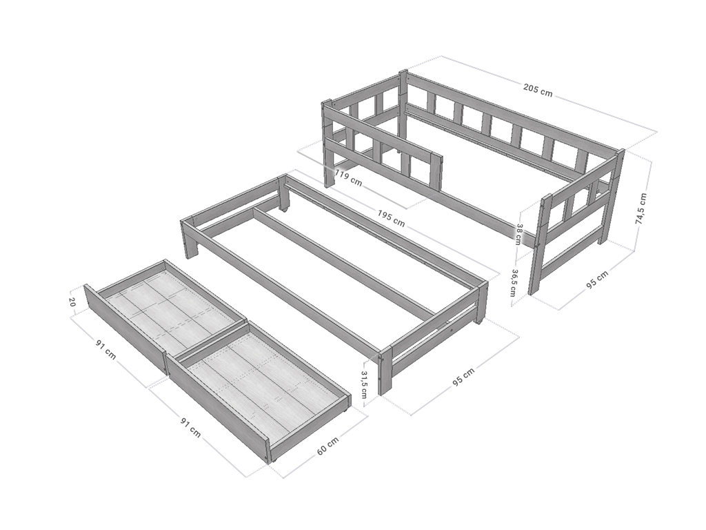 | Sada obsahuje: | jednolůžkovou postel FENCE 90x200 cm, přistýlku 90x190 cm, dvojitý šuplík STORAGE 55x180 cm |