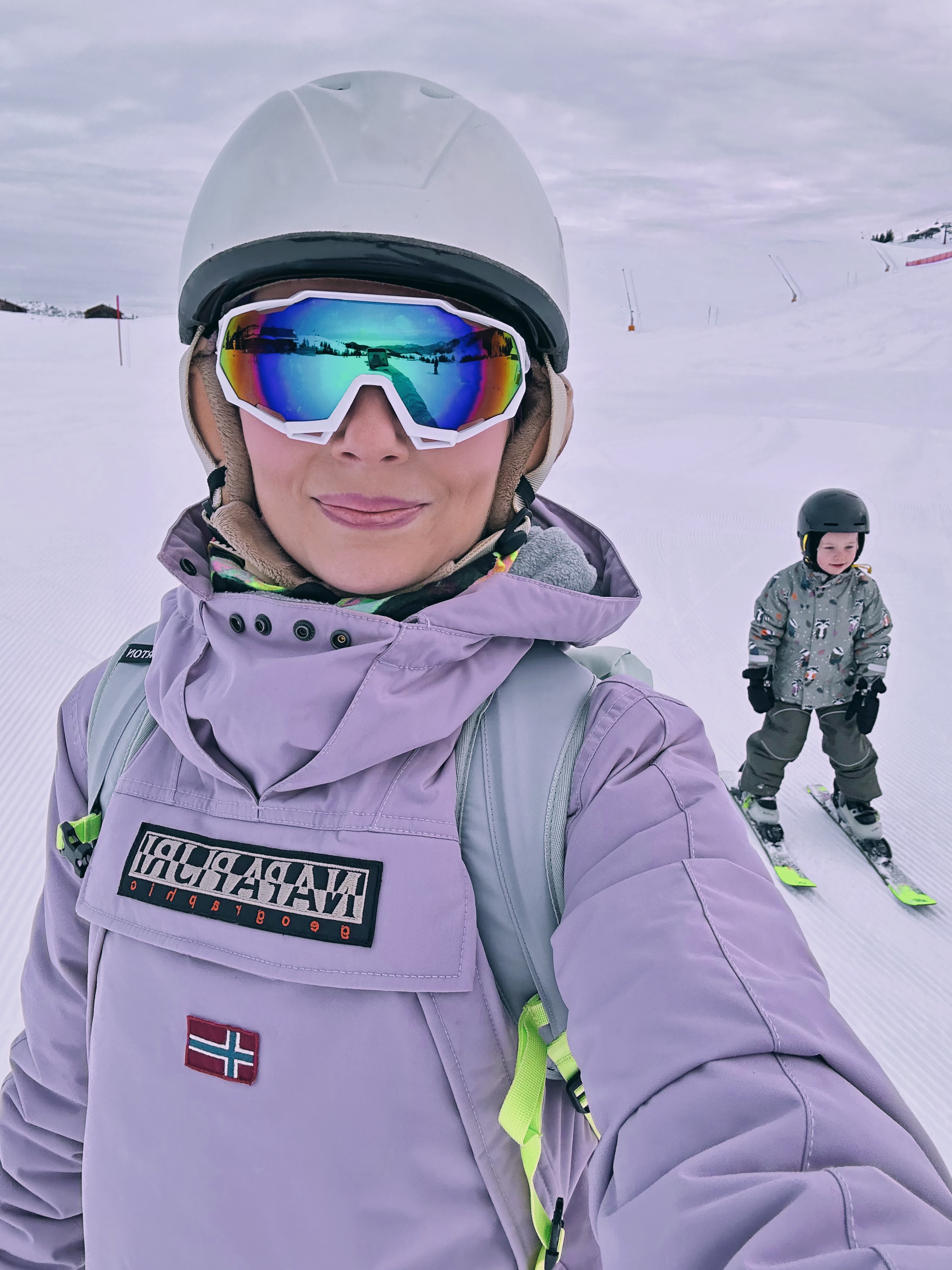 Nyní pozor – tento postup se instruktory prý nedoporučuje. To jsem následně zjistila, když jsem videa z našeho prvního lyžovacího dne nahrála na Instagram. Nicméně – takhle naši lyžovat kdysi naučili nás, a tak jsme k tomu také přistoupili. Dori se jednoduše rukama chytil lana a my jsme ho tahali na rovince tam a zpět, sem a tam. Údajně je ale lepší dítě rovnou vzít na mírný malý kopeček a rovnou s ním začít plužit. Všichni mi říkali, ať mu řeknu, aby na lyžích udělal pizzu, že děti hned pochopí. Dori však pizzu nejí, a tak mu to mnoho neřeklo. :D