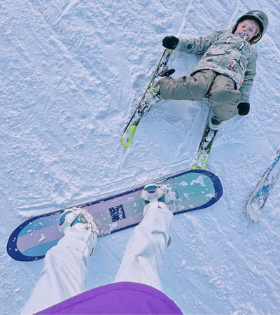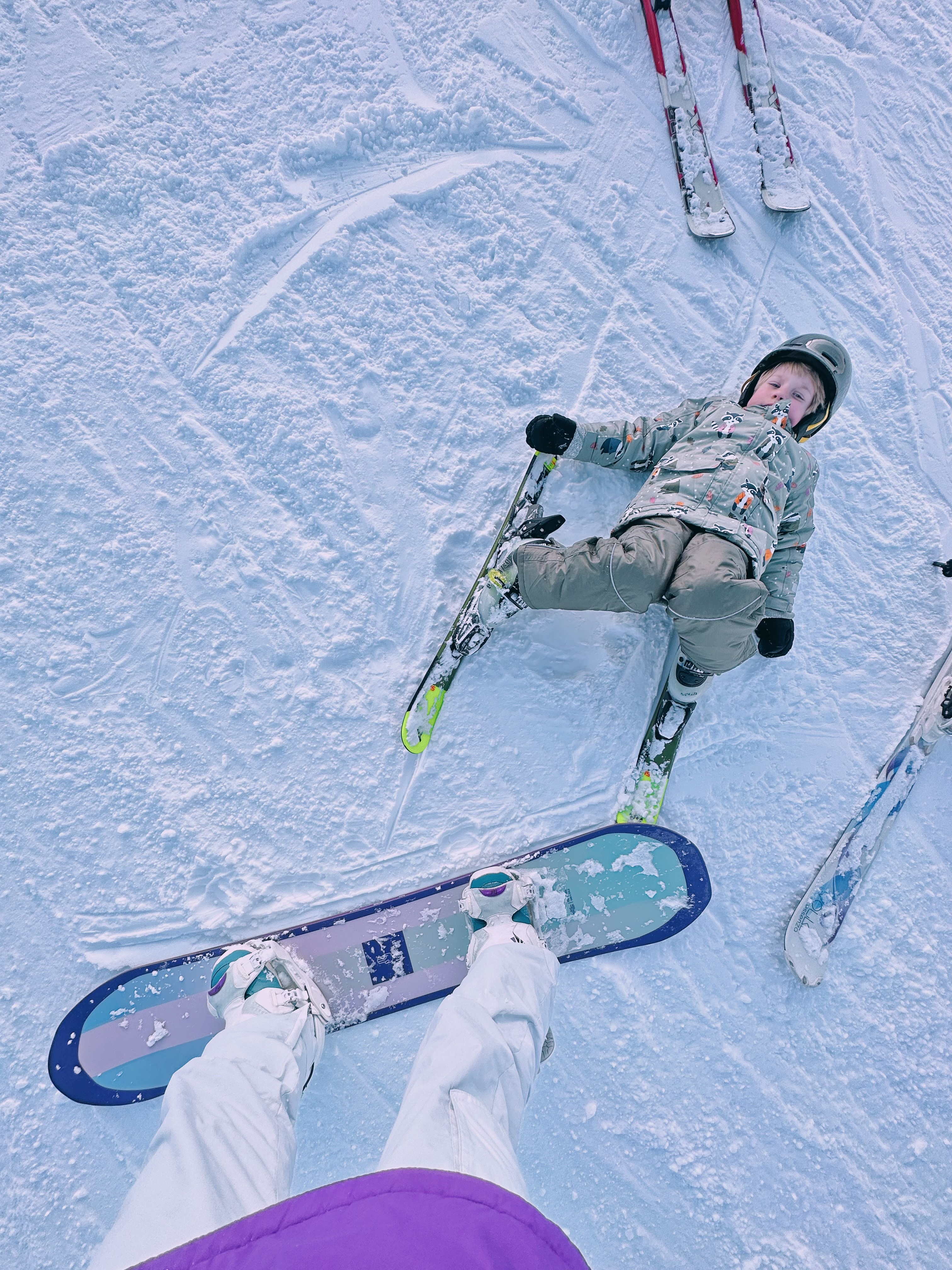 My jsme zrovna teď v naší druhé sezóně a Alpy jsme hned zkraje zimy hecli. U nás ještě nebyl sníh, a tak jsme neměli kde oprášit loni nacvičené dovednosti. No a stalo se to, čeho jsem se obávala. Dori se na to postavil, spadnul a brečel, že to už neumí. Stačilo ale dvacet minut na dětském kopečku a všechno bylo zpátky a celkem pohodově jsme si pak zajezdili. Sluší se teda říct, že spoustu práce s ním udělal právě děda, který ho nejčastěji po karambolech zvedá, pomáhá mu ze sedačky a čeká na něj – tohle všechno totiž není nejjednodušší, když nemáte lyže, ale právě snowboard jako já.