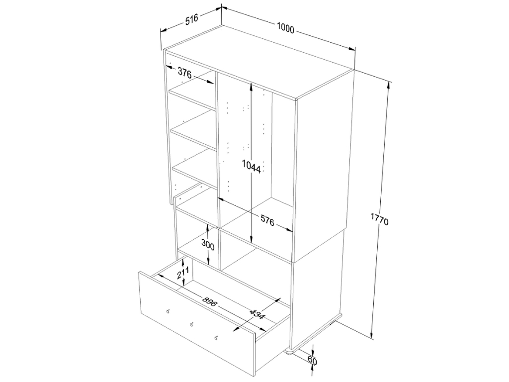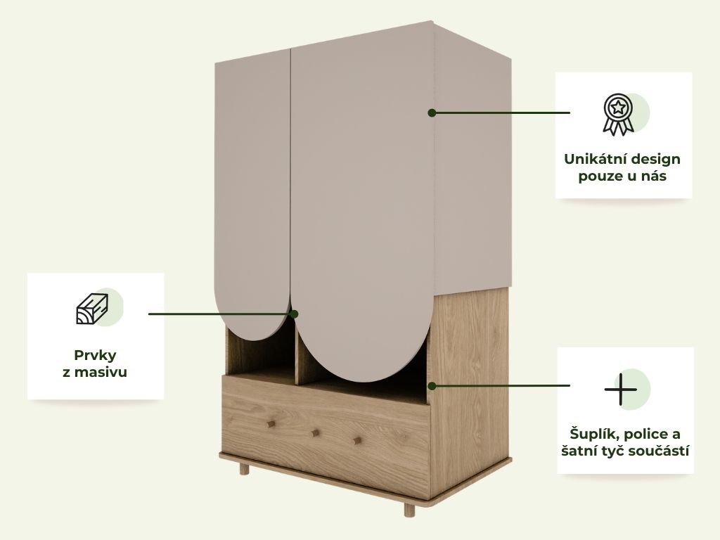 | Vlastnosti produktů: | Se šuplíky, S šatní tyčí, S policemi, S podnoží |