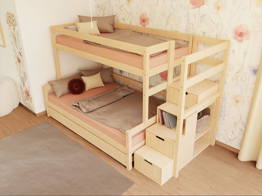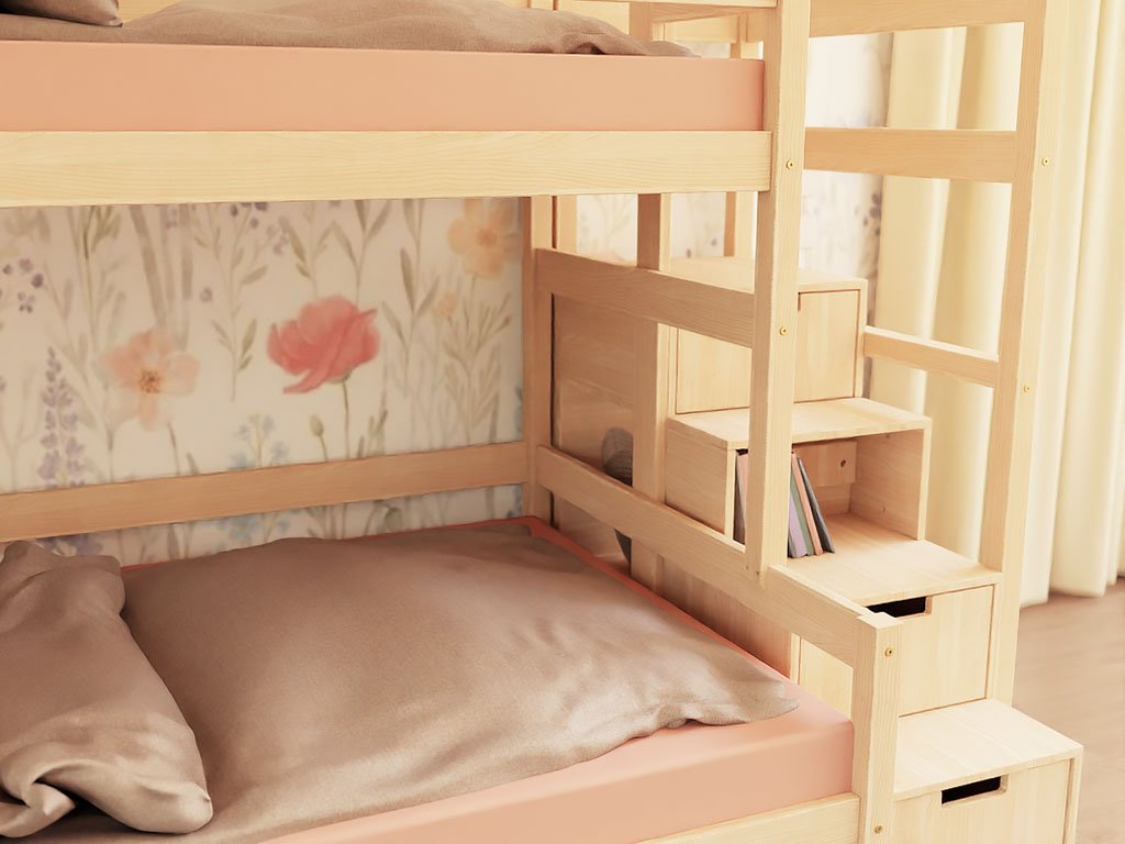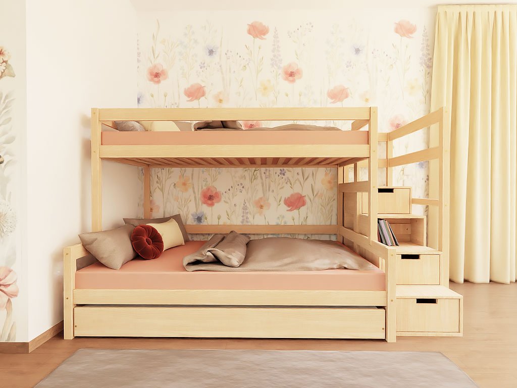 Zvolte do dětského pokoje funkční patrovou postel se spoustou úložného prostoru. Kvalitní ruční zpracování ze dřeva a EKO barvy vhodné pro dětský nábytek i hračky.