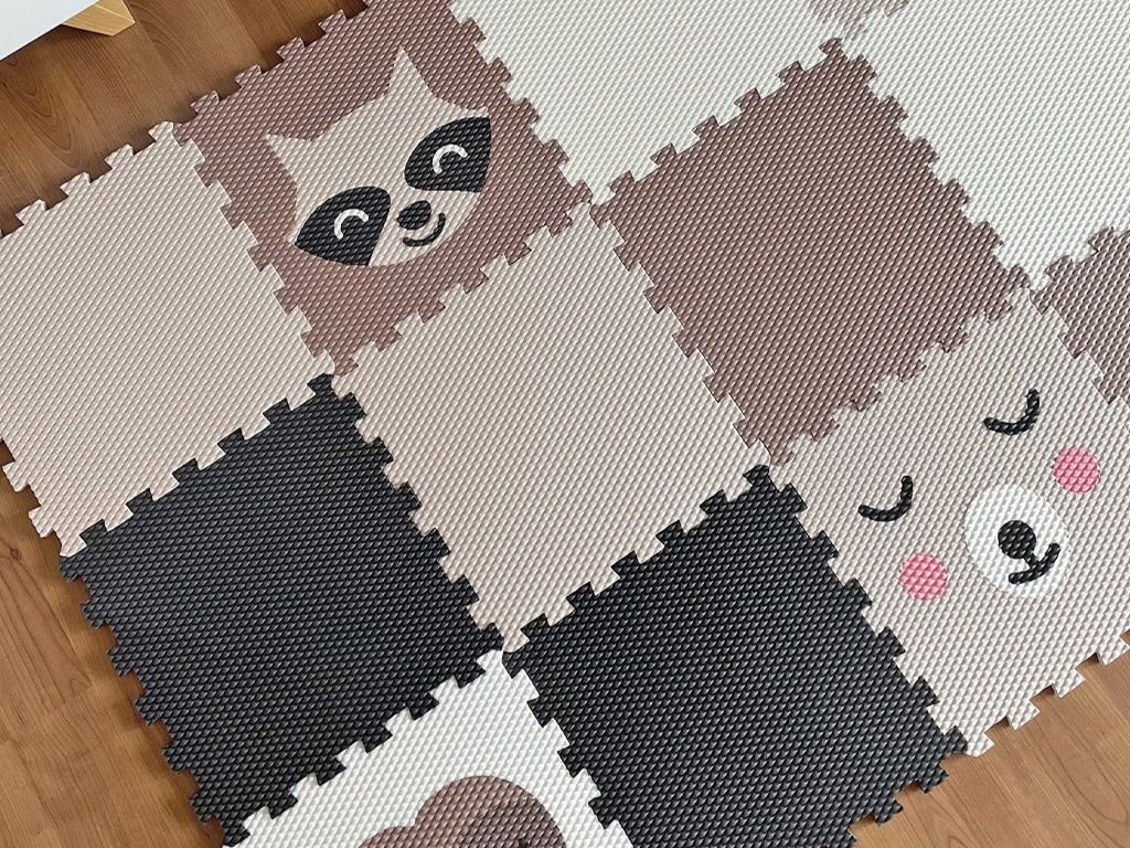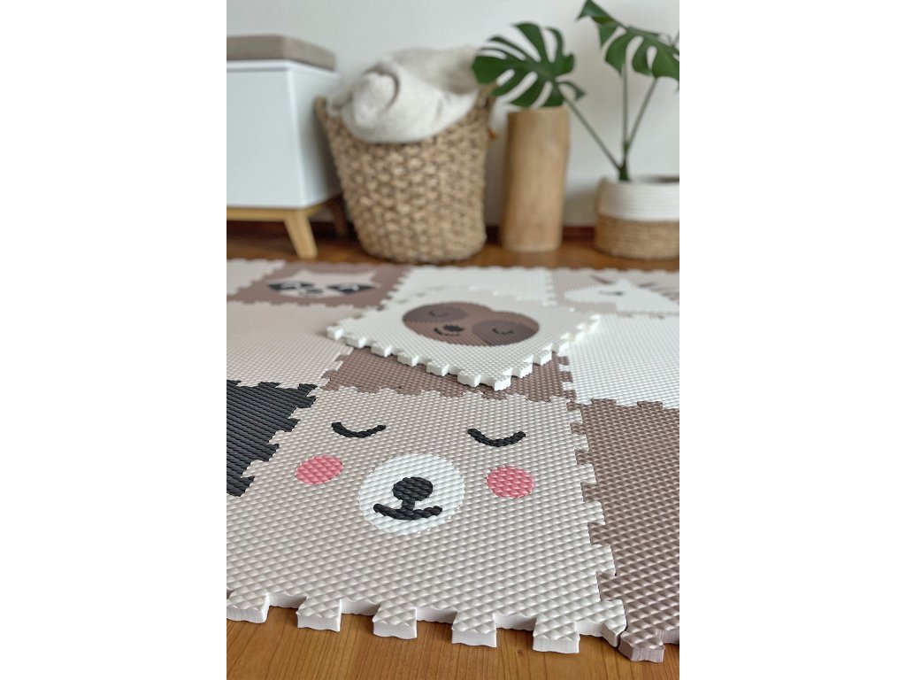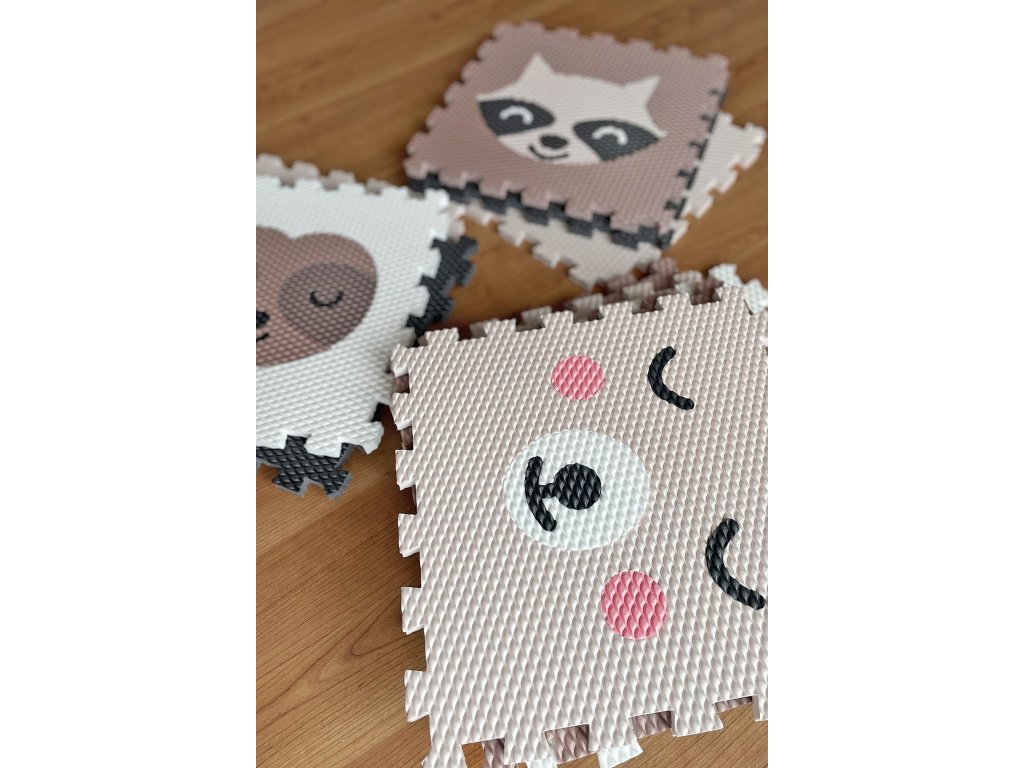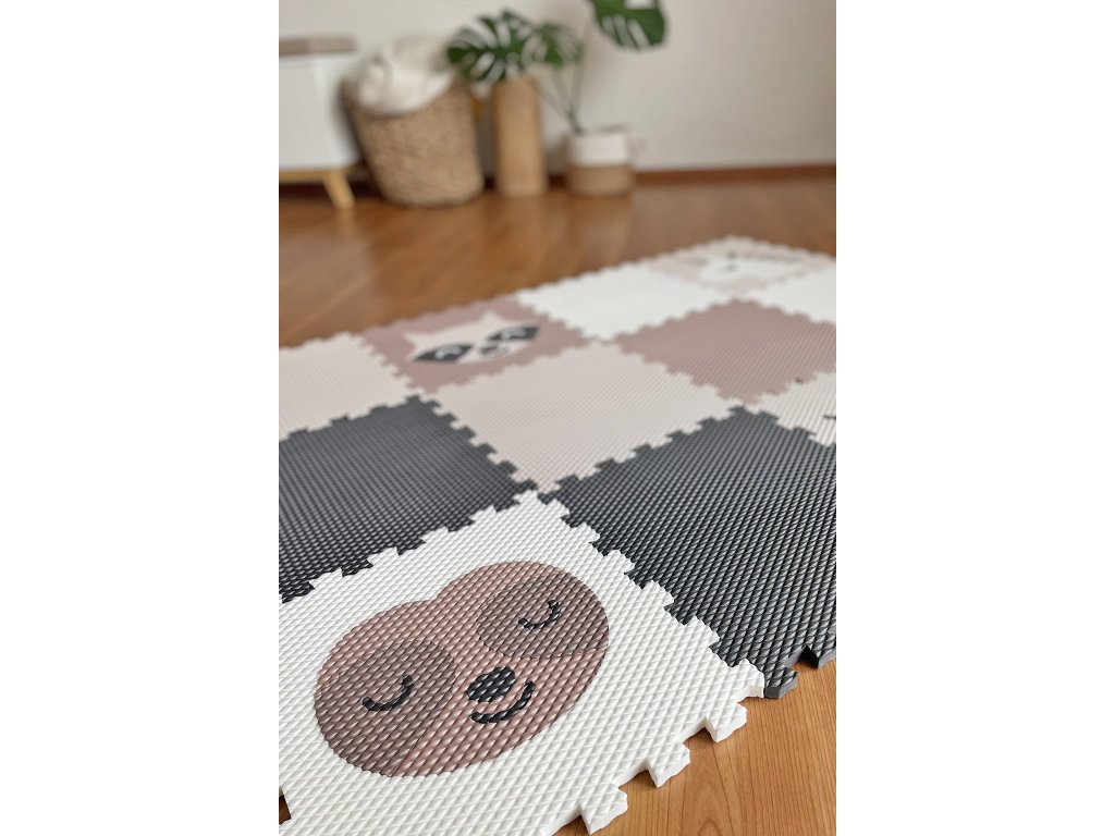 | Sada obsahuje: | 12 pěnových puzzle podložek (2 černé puzzle, 2 bílé puzzle, 2 krémové puzzle, 2 hnědé puzzle, 1 bílá puzzle s hnědým lenochodem, 1 krémová puzzle s medvědem, 1 krémová puzzle s bílým jednorožcem, 1 hnědá puzzle s krémovým mývalem) |