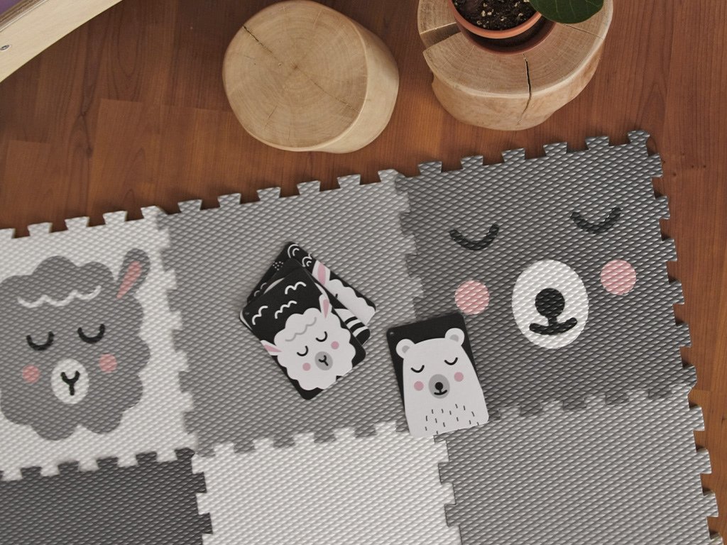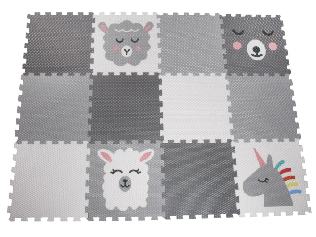 | Sada obsahuje: | 12 pěnových puzzle podložek (3 šedé puzzle, 3 světle šedé puzzle, 2 bílé puzzle, 1 bílá puzzle se světle šedým jednorožcem, 1 bílý beránek, 1 světle šedá lama, 1 šedý medvídek) |