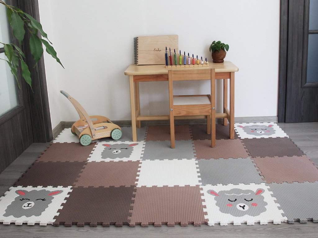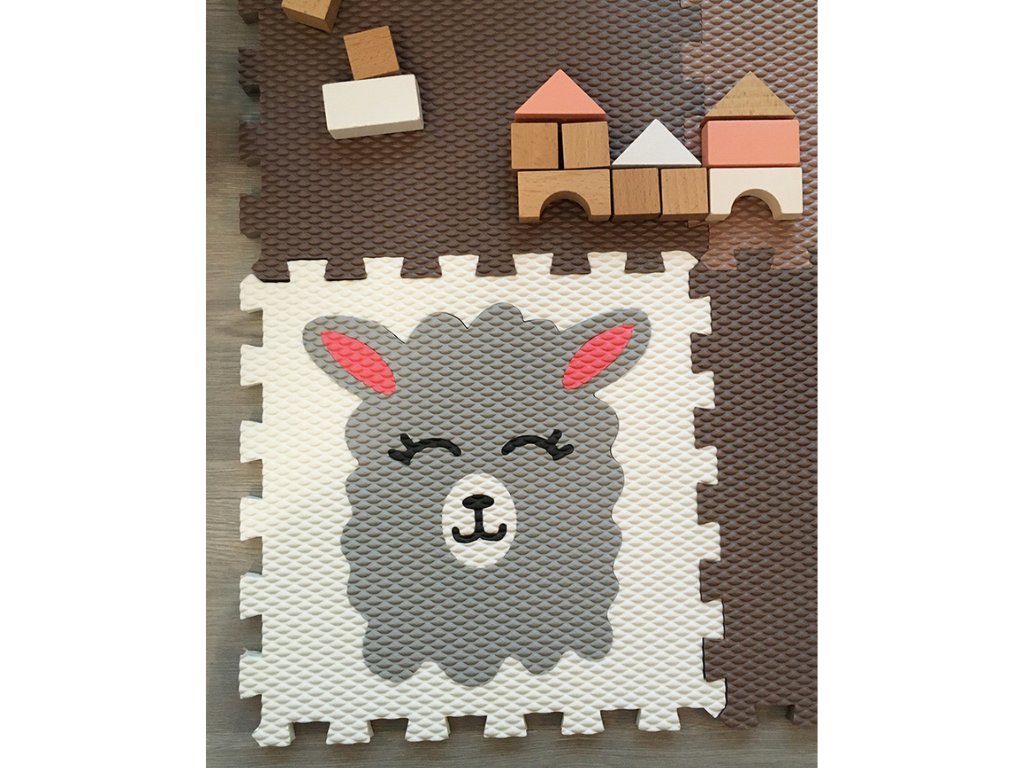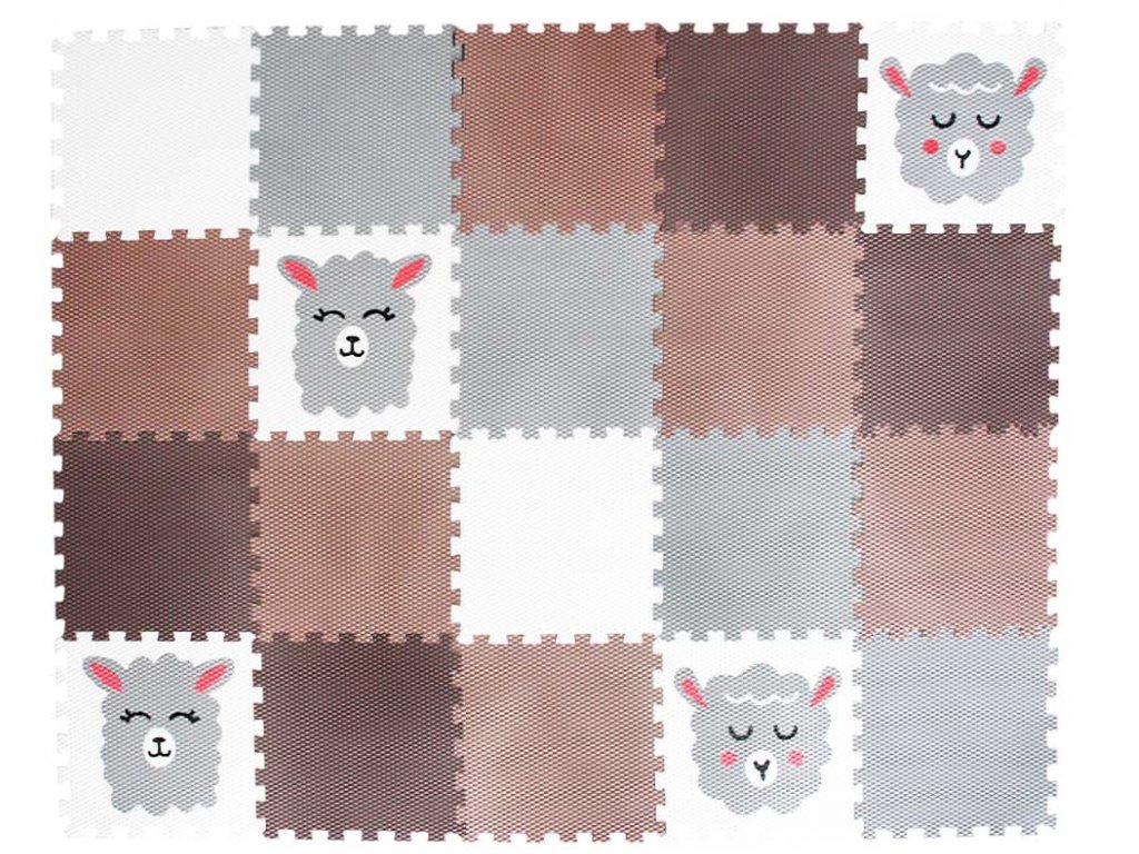 | Sada obsahuje: | 20 pěnových puzzle podložek (6 hnědých puzzlí, 4 tmavě hnědé puzzle, 4 světle šedé puzzle, 2 bílé puzzle, 2 bílé lamy, 2 bílí beránci) |