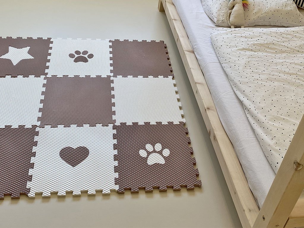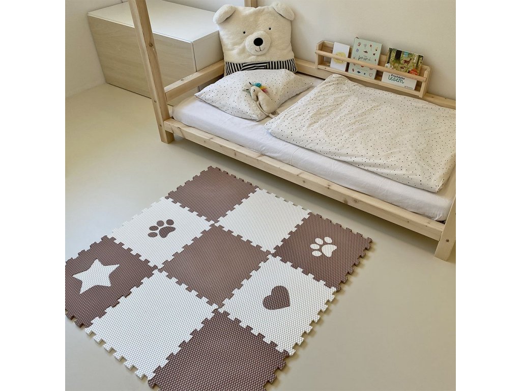 | Sada obsahuje: | 9 podlahových dílů (2 ks bílý, 3 ks hnědý, 1 ks bílý s hnědým srdcem, 1 ks bílý s hnědou tlapkou, 1 ks hnědý s bílou tlapkou, 1 ks hnědý s bílou hvězdou) |