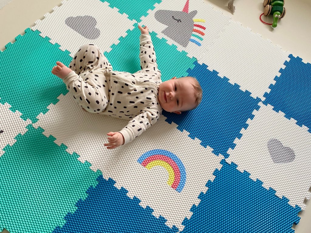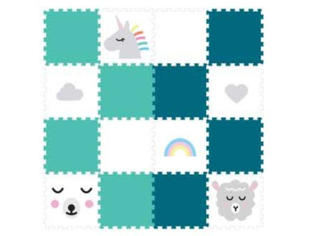 | Sada obsahuje: | 16 pěnových puzzle podložek (4 jarní zelené puzzle, 4 tyrkysové puzzle, 2 bílé puzzle, 1 bílý medvídek, 1 bílá puzzle se světle šedým srdíčkem, 1 bílá puzzle se světle šedým jednorožcem, 1 bílý beránek, 1 bílá duha, 1 bílá puzzle se světle šedým mráčkem) |