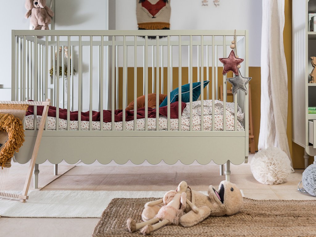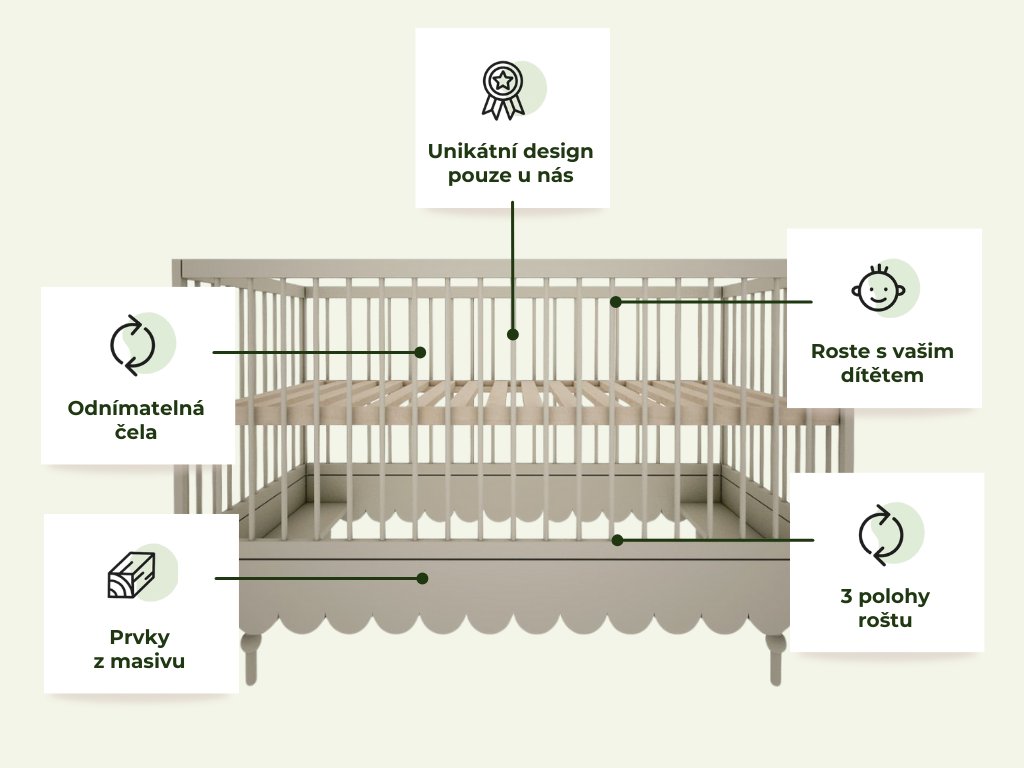 | Speciální výhody: | 3 úrovně nastavení roštu, odnímatelné příčky, díky přídavným prvkům možná přestavba na postel pro starší dítě, odnímatelné bočnice |