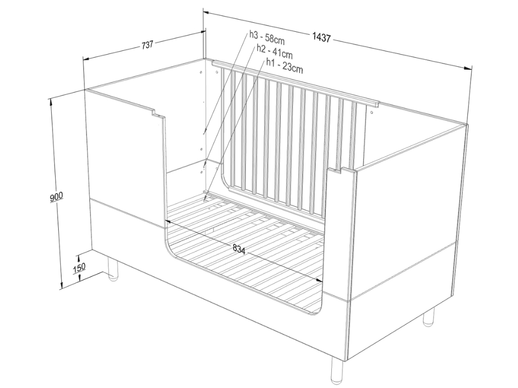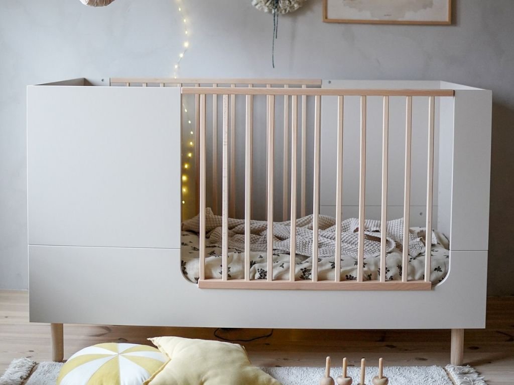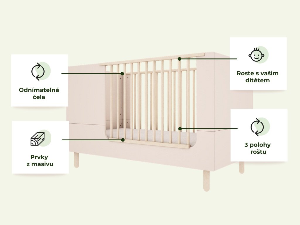 | Speciální výhody: | 3 úrovně nastavení roštu, odnímatelné příčky, díky přídavným prvkům možná přestavba na postel pro starší dítě, odnímatelné bočnice |