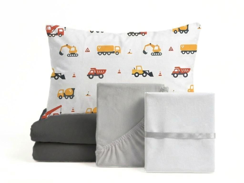 Sada lůžkovin: bavlněné povlečení AUTA + prostěradlo světle šedé jersey + chránič matrace