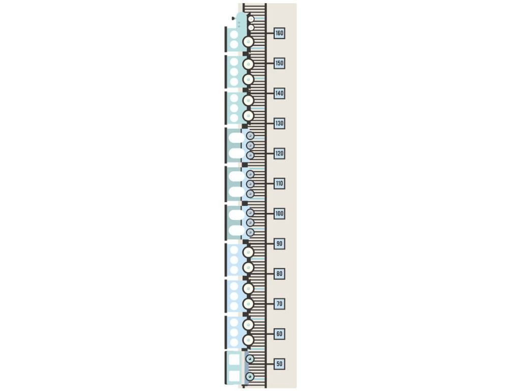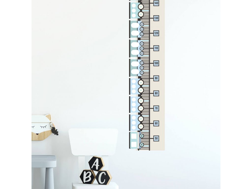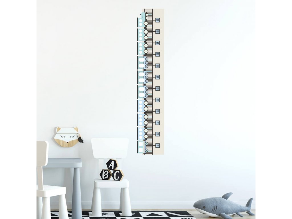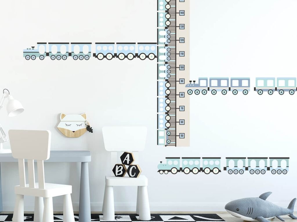 Samolepící nástěnný metr VLAKY do dětského pokoje MODRÝ