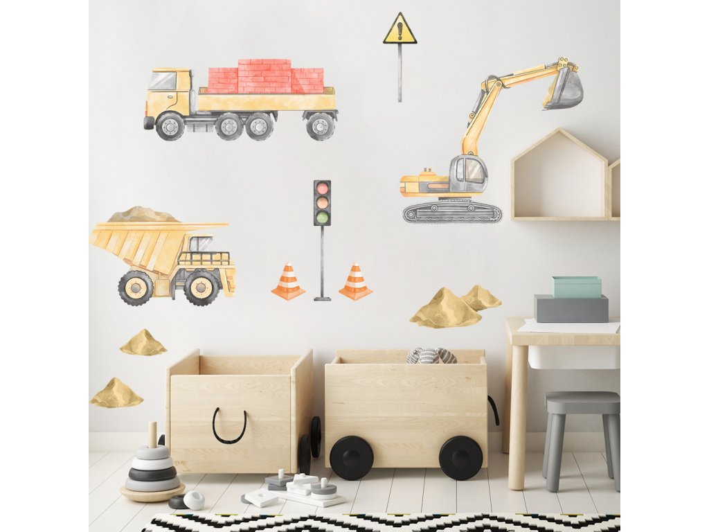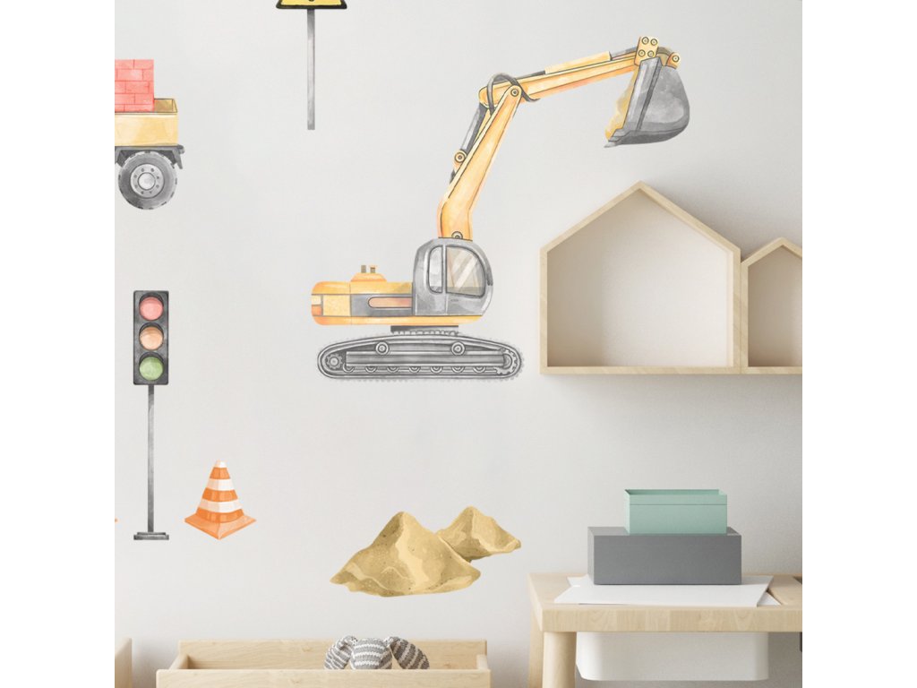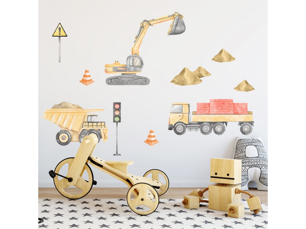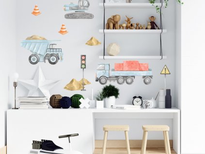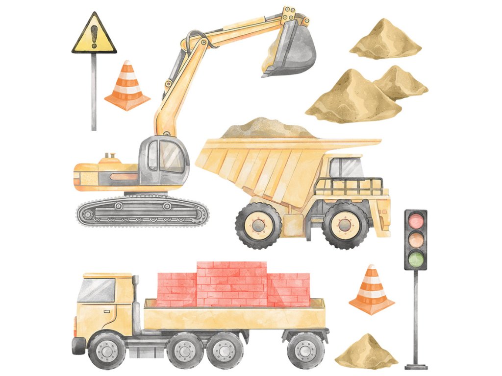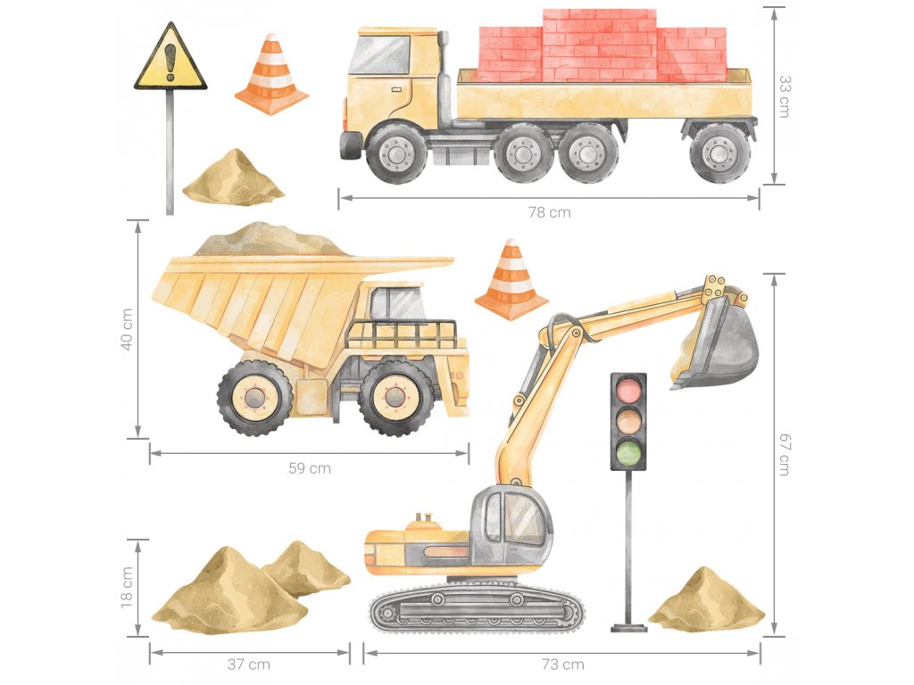 | Sada obsahuje: | bagr, sklápěč, nákladní auto, semafor, dopravní značku, patníky a písek |