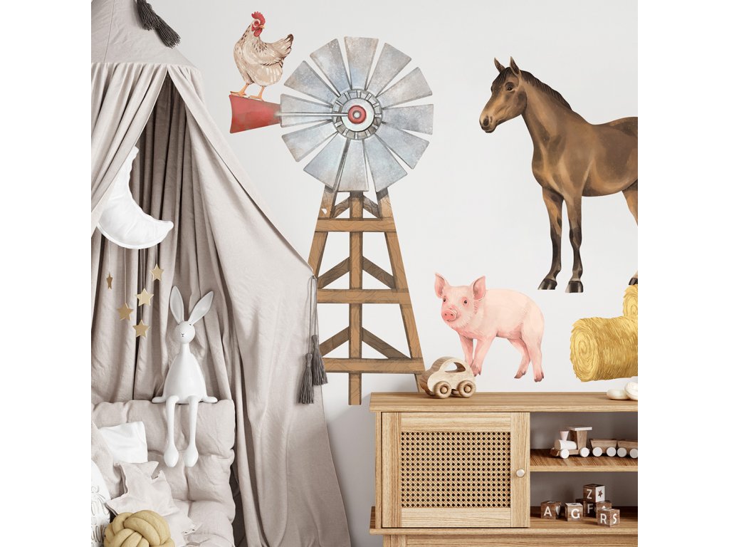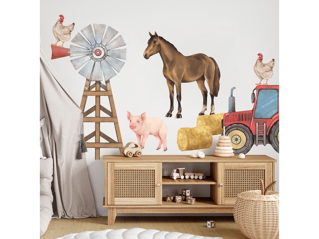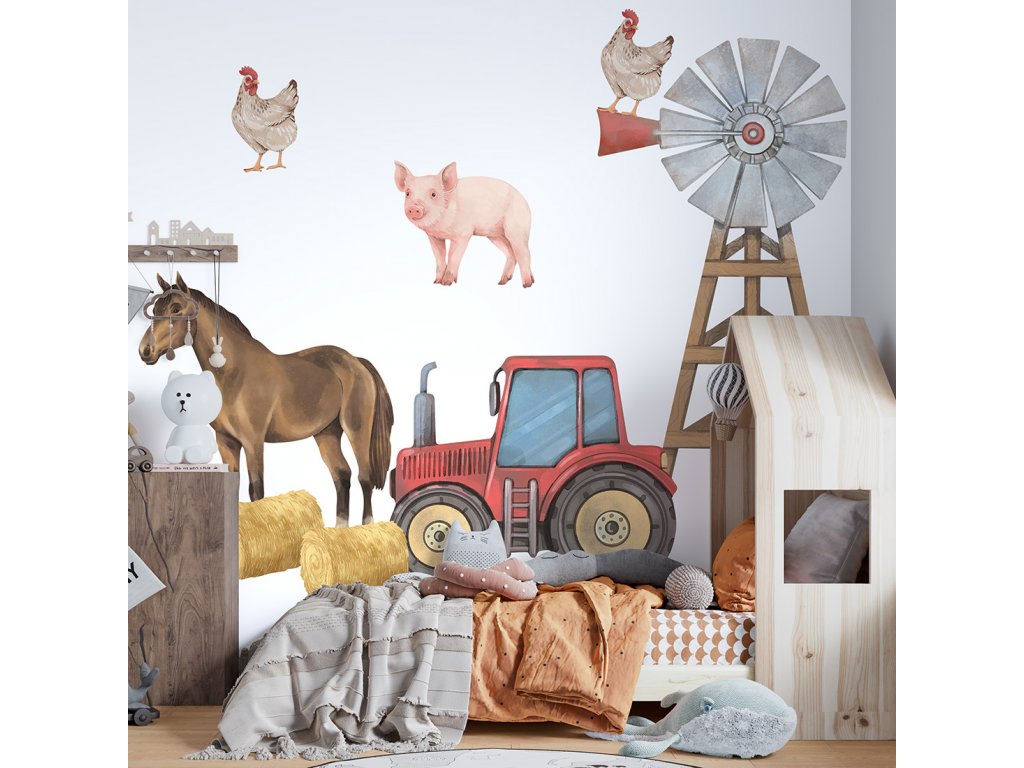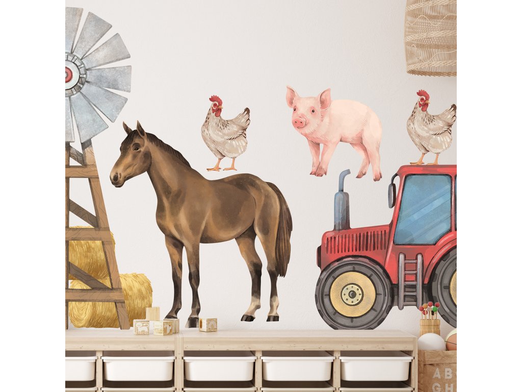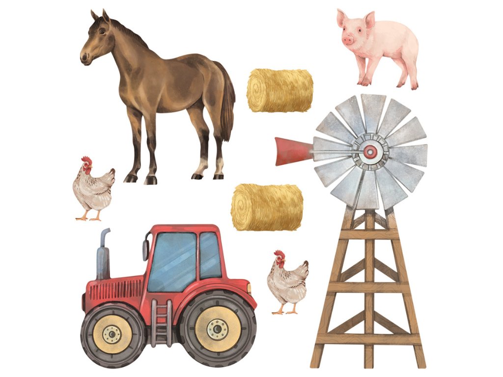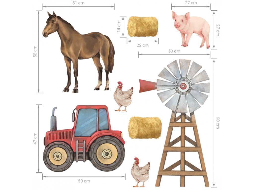| Sada obsahuje: | koně, traktor, větrný mlýn, prase, slepice, snopy sena |