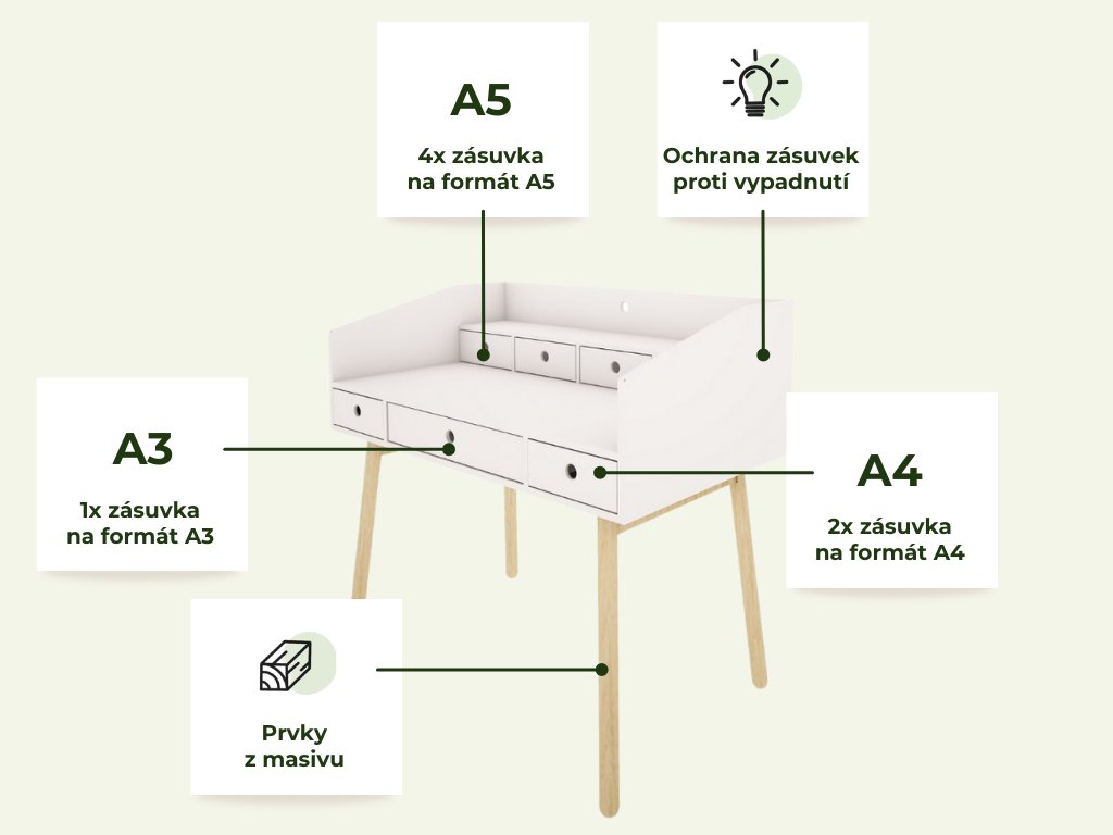 | Rozměry šuplíků: | 4 horní šuplíky ve formátu A5, 2 spodní vnější ve formátu A4, spodní prostřední šuplík ve formátu A3 |