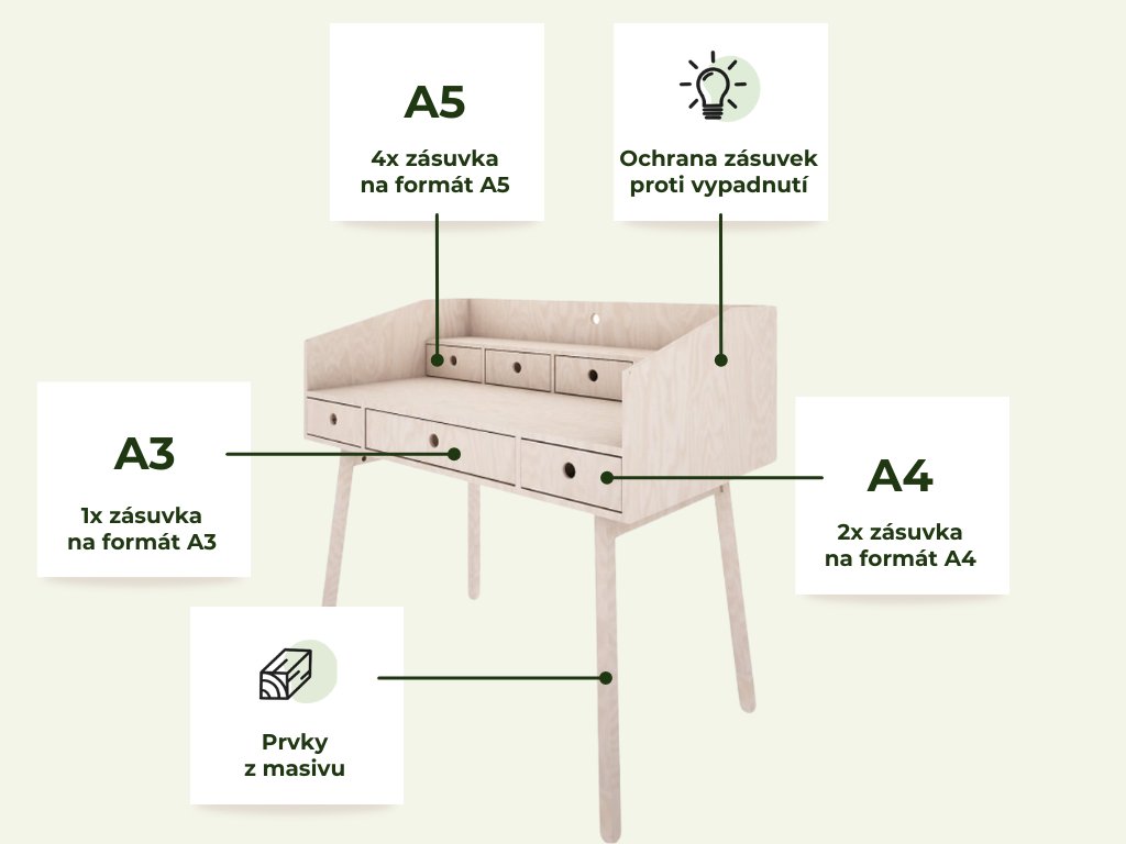 | Rozměry šuplíků: | 4 horní šuplíky ve formátu A5, 2 spodní vnější ve formátu A4, spodní prostřední šuplík ve formátu A3 |