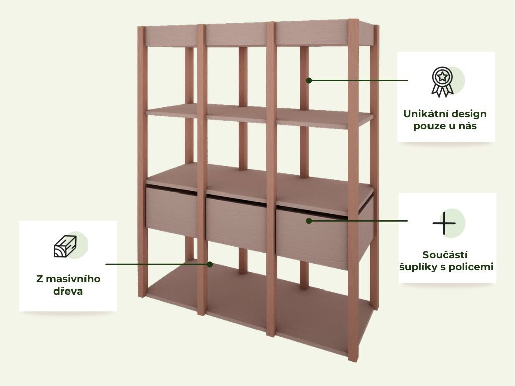 | Materiál: | laminované melaminové desky, prvky z borového dřeva |
