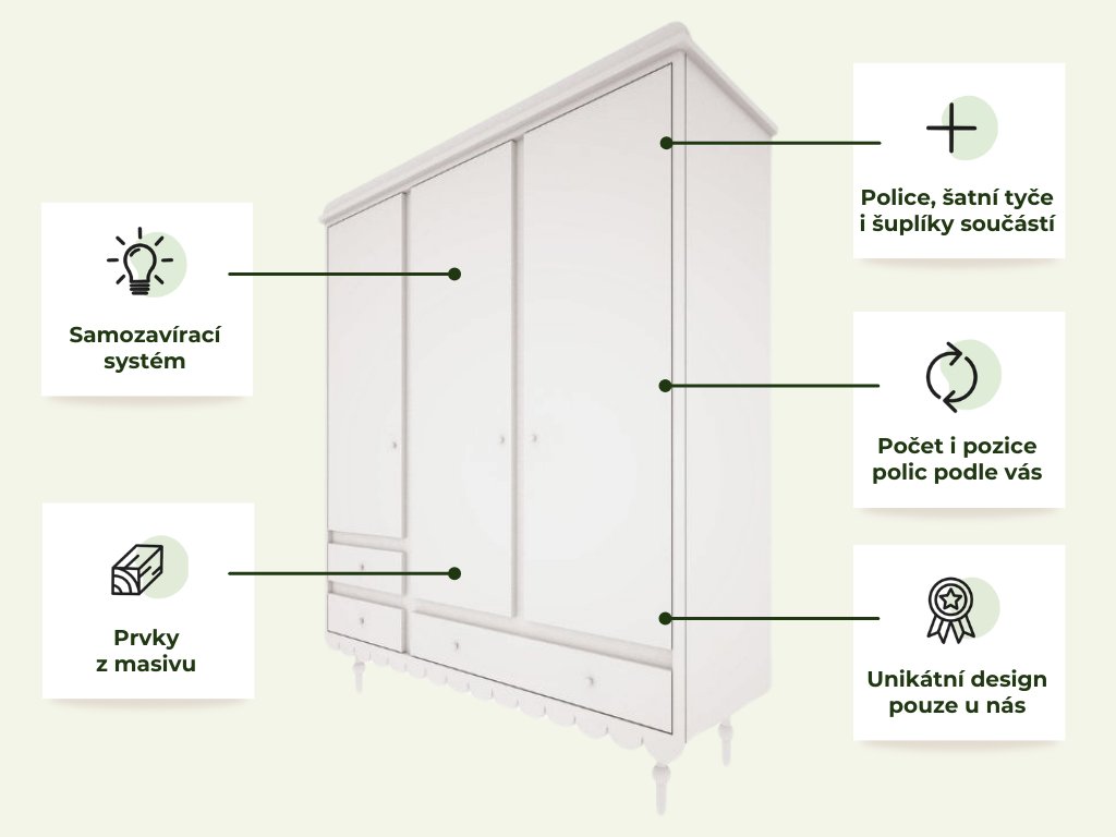 | Součástí: | šatní tyče, šuplíky, police v přírodní barvě |