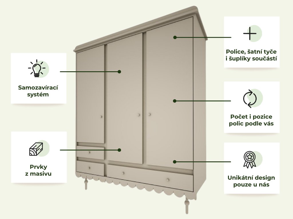 | Součástí: | šatní tyče, šuplíky, police v přírodní barvě |